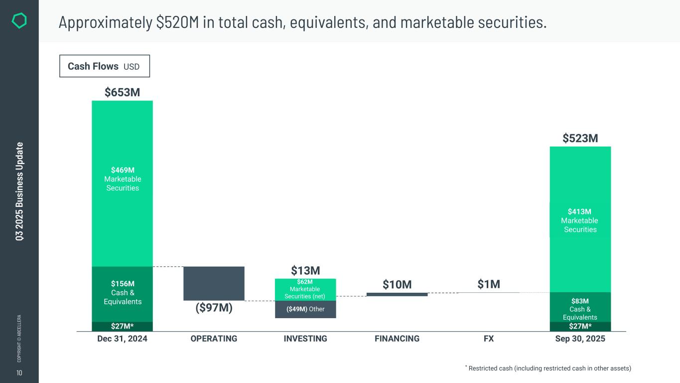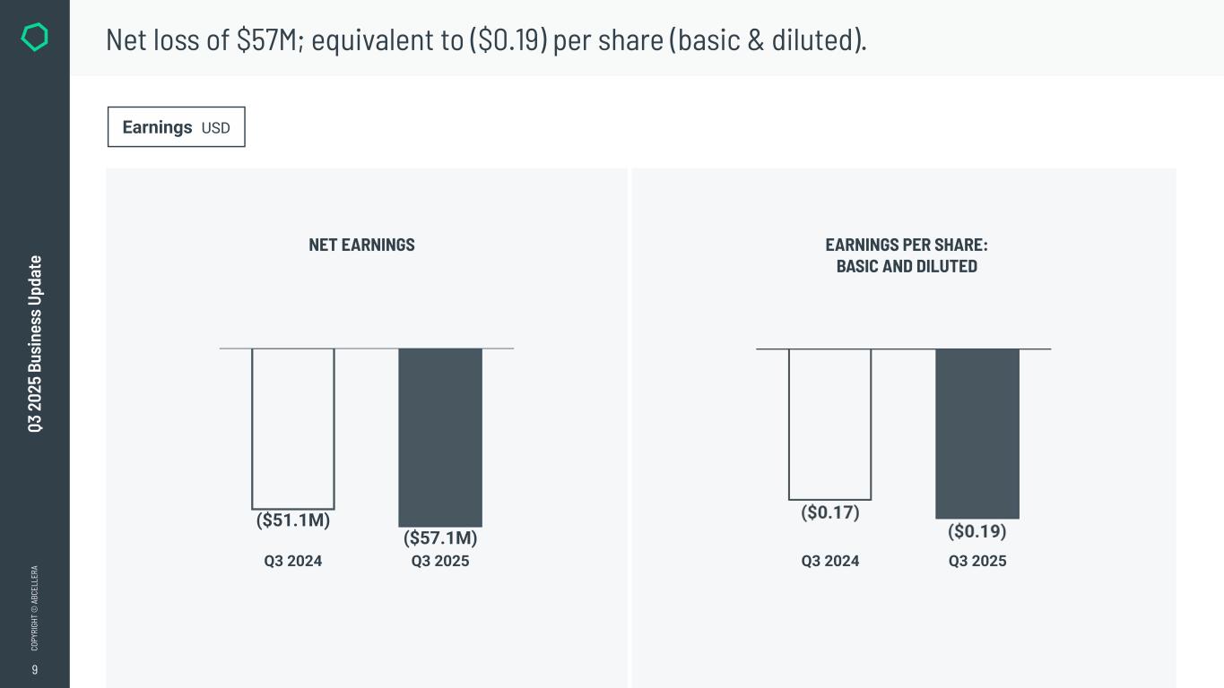 9 CO PY RI GH T © A BC EL LE RA Q3 2 02 5 Bu si ne ss U pd at e Net loss of $57M; equivalent to ($0.19) per share (basic & diluted). Earnings USD NET EARNINGS EARNINGS PER SHARE: BASIC AND DILUTED Q3 2024 Q3 2025 ($51.1M) ($57.1M) Q3 2024 Q3 2025
