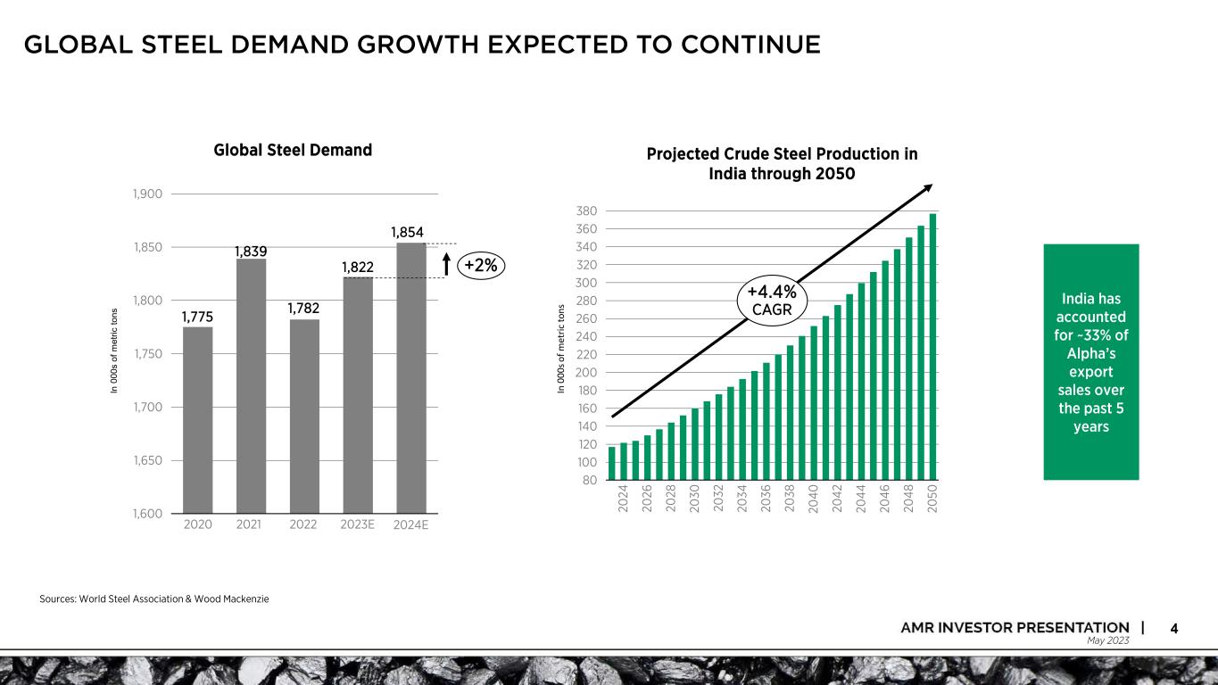 May 2023 4 India has accounted for ~33% of Alpha’s export sales over the past 5 years Sources: World Steel Association & Wood Mackenzie Global Steel Demand Projected Crude Steel Production in India through 2050 200 80 220 100 140 120 340 160 180 240 260 320 360 280 300 380 20 26 20 30 20 24 20 28 20 34 20 36 20 38 20 40 20 44 20 42 20 46 20 48 20 50 20 32 +4.4% CAGR In 0 00 s o f m et ric to ns GLOBAL STEEL DEMAND GROWTH EXPECTED TO CONTINUE 1,775 1,839 1,822 1,750 1,650 1,600 1,900 1,700 1,800 1,850 20222020 1,782 2021 2023E +2% In 0 00 s of m et ric to ns 1,854 2024E