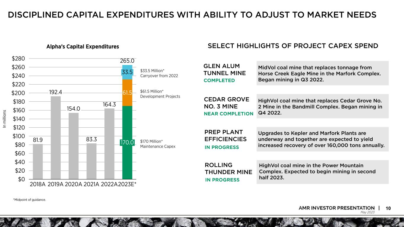 May 2023 MULTI-FACETED SHAREHOLDER VALUE CREATION 9 ▪ Since the start of 3Q 2021, Alpha has reduced its term loan by $550 million and the remaining balance was eliminated with a $99.4 million payment on June 3, 2022. ▪ To further enhance shareholder value, on March 7, 2022, Alpha announced a $150 million share repurchase program. On May 5, 2022, Alpha announced that its board increased their authorization by another $450 million, bringing the share buyback program to a level of $600 million. On November 4, 2022, Alpha’s board increased the program authorization to $1 billion. On February 21, 2023, Alpha’s board increased the program authorization to $1.2 billion. – As of May 4, 2023, the company had repurchased ~4.8 million shares for a total of ~$715 million. ▪ On May 5, 2022, Alpha announced a fixed dividend of $1.50 per share annually, with $0.375 to be paid each quarter. On August 4, 2022, the Board increased the quarterly dividend amount to $0.392 per share. On November 4, 2022, the Board increased the quarterly dividend amount to $0.418 per share. On February 21, 2023, the Board increased the quarterly dividend amount to $0.44 per share. On May 3, 2023, the Board increased the quarterly dividend amount to $0.50 per share. ▪ On November 4, Alpha’s board declared a one-time, special dividend of $5.00 per share to be payable on January 3, 2023, for holders of record on December 15, 2022. Eliminated term loan balance on June 3, 2022, with over $550 million paid since 3Q21 One-time, special dividend of $5.00 per share paid in Jan. 2023 Fixed quarterly cash dividend of $0.50 per share $1.2 billion program in place with ~$715 million executed as of 5/4/23 DEBT ELIMINATION SHARE REPURCHASE DIVIDEND PROGRAM