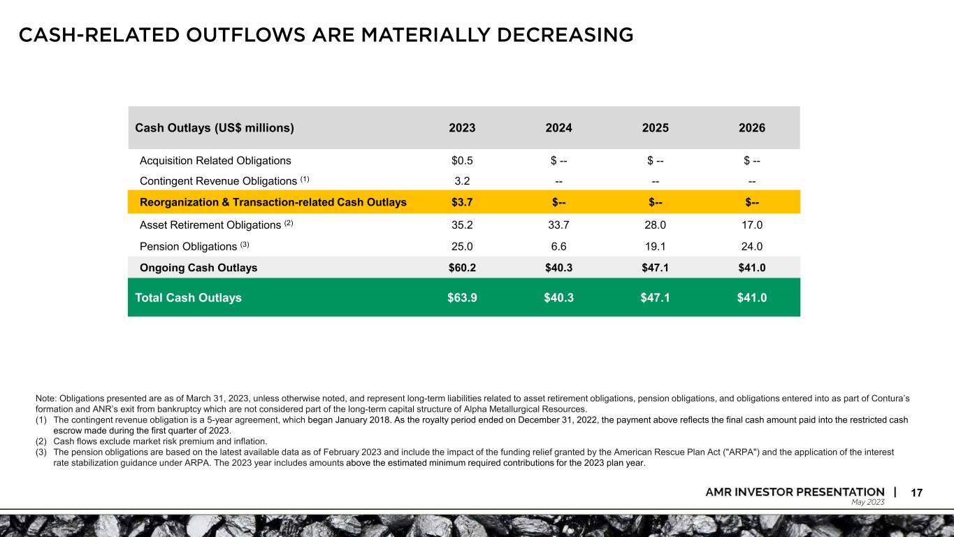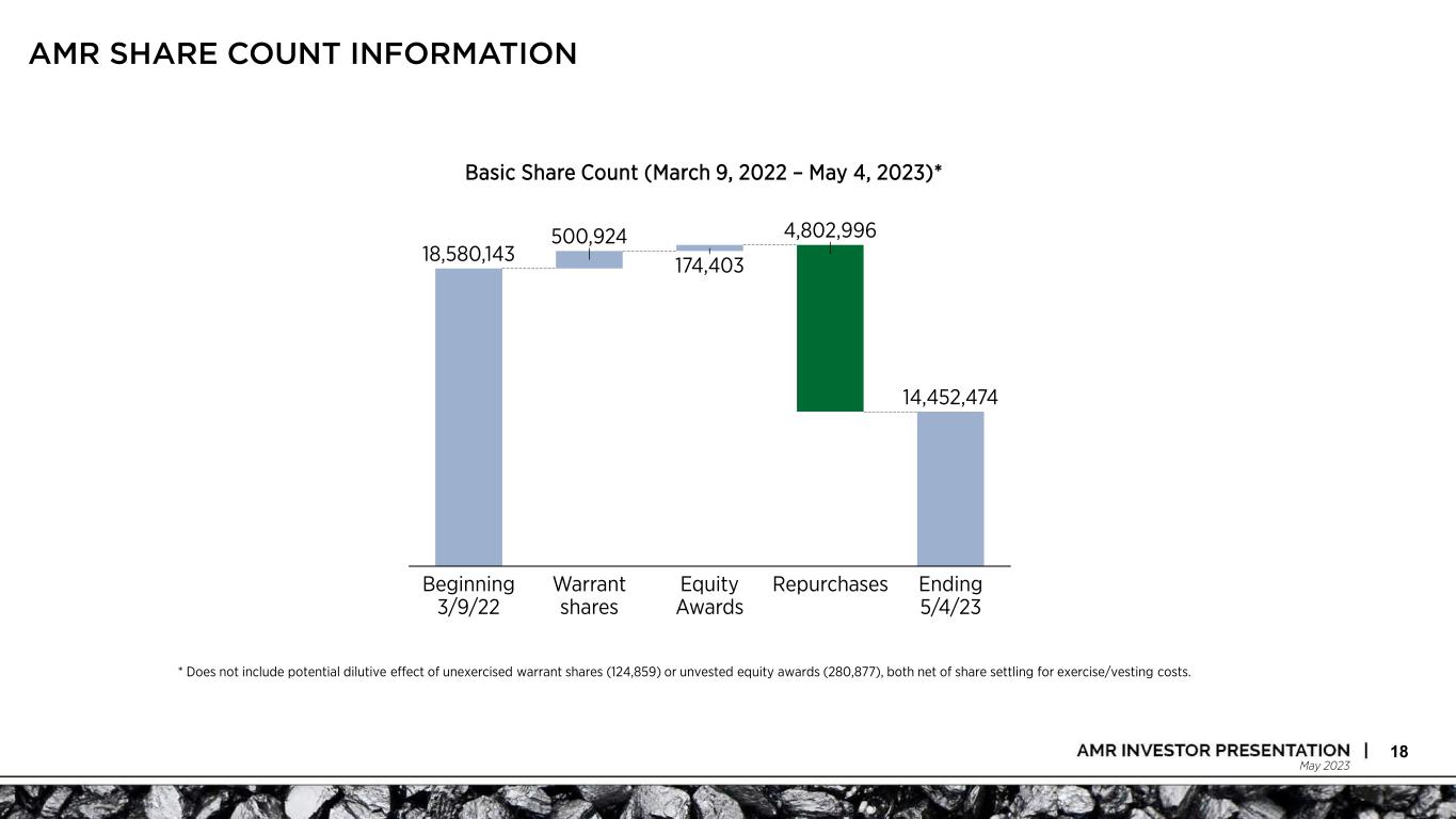 May 2023 CASH-RELATED OUTFLOWS ARE MATERIALLY DECREASING 17 Cash Outlays (US$ millions) 2023 2024 2025 2026 Acquisition Related Obligations $0.5 $ -- $ -- $ -- Contingent Revenue Obligations (1) 3.2 -- -- -- Reorganization & Transaction-related Cash Outlays $3.7 $-- $-- $-- Asset Retirement Obligations (2) 35.2 33.7 28.0 17.0 Pension Obligations (3) 25.0 6.6 19.1 24.0 Ongoing Cash Outlays $60.2 $40.3 $47.1 $41.0 Total Cash Outlays $63.9 $40.3 $47.1 $41.0 Note: Obligations presented are as of March 31, 2023, unless otherwise noted, and represent long-term liabilities related to asset retirement obligations, pension obligations, and obligations entered into as part of Contura’s formation and ANR’s exit from bankruptcy which are not considered part of the long-term capital structure of Alpha Metallurgical Resources. (1) The contingent revenue obligation is a 5-year agreement, which began January 2018. As the royalty period ended on December 31, 2022, the payment above reflects the final cash amount paid into the restricted cash escrow made during the first quarter of 2023. (2) Cash flows exclude market risk premium and inflation. (3) The pension obligations are based on the latest available data as of February 2023 and include the impact of the funding relief granted by the American Rescue Plan Act ("ARPA") and the application of the interest rate stabilization guidance under ARPA. The 2023 year includes amounts above the estimated minimum required contributions for the 2023 plan year.