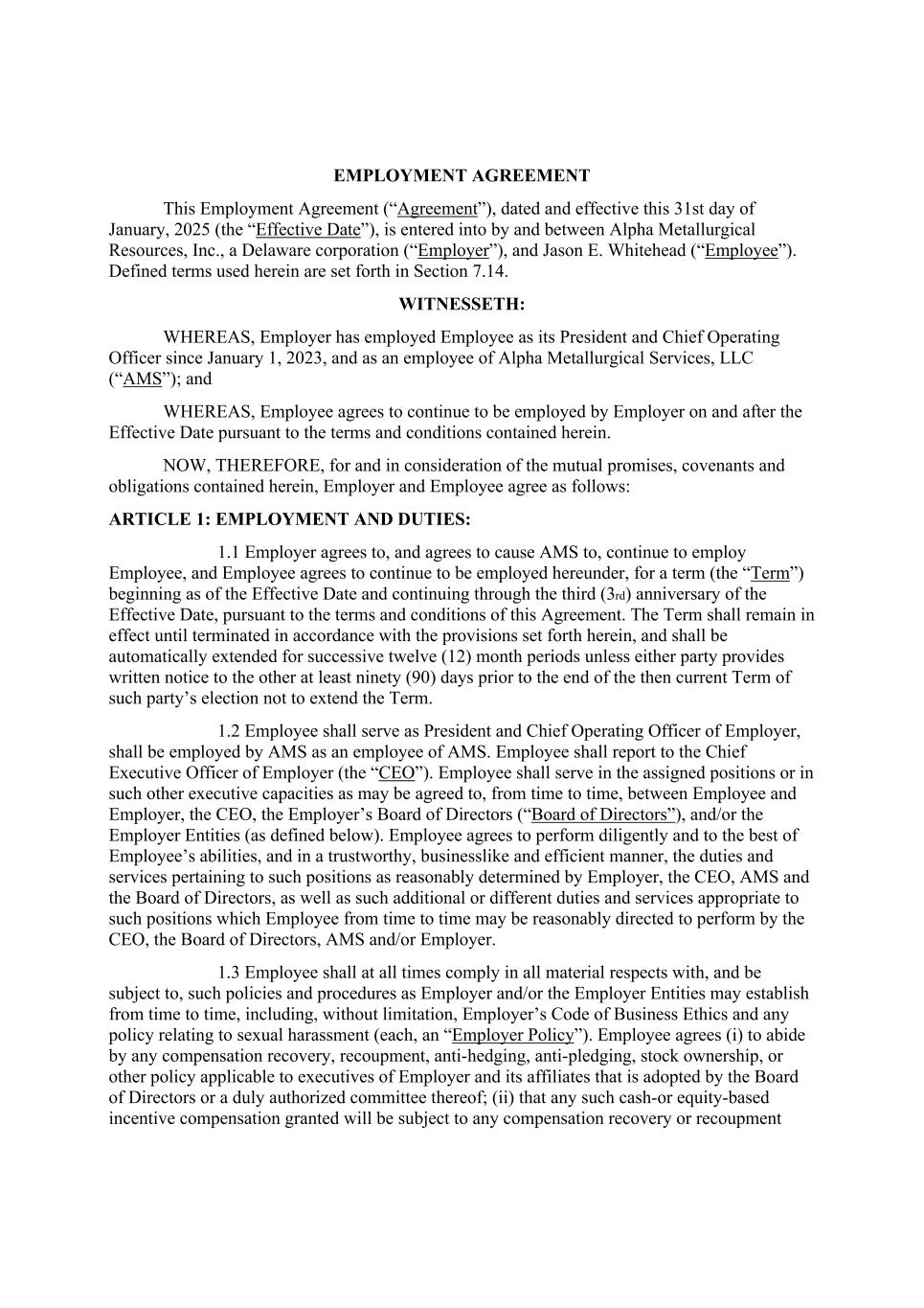 EMPLOYMENT AGREEMENT This Employment Agreement (“Agreement”), dated and effective this 31st day of January, 2025 (the “Effective Date”), is entered into by and between Alpha Metallurgical Resources, Inc., a Delaware corporation (“Employer”), and Jason E. Whitehead (“Employee”). Defined terms used herein are set forth in Section 7.14. WITNESSETH: WHEREAS, Employer has employed Employee as its President and Chief Operating Officer since January 1, 2023, and as an employee of Alpha Metallurgical Services, LLC (“AMS”); and WHEREAS, Employee agrees to continue to be employed by Employer on and after the Effective Date pursuant to the terms and conditions contained herein. NOW, THEREFORE, for and in consideration of the mutual promises, covenants and obligations contained herein, Employer and Employee agree as follows: ARTICLE 1: EMPLOYMENT AND DUTIES: 1.1 Employer agrees to, and agrees to cause AMS to, continue to employ Employee, and Employee agrees to continue to be employed hereunder, for a term (the “Term”) beginning as of the Effective Date and continuing through the third (3rd) anniversary of the Effective Date, pursuant to the terms and conditions of this Agreement. The Term shall remain in effect until terminated in accordance with the provisions set forth herein, and shall be automatically extended for successive twelve (12) month periods unless either party provides written notice to the other at least ninety (90) days prior to the end of the then current Term of such party’s election not to extend the Term. 1.2 Employee shall serve as President and Chief Operating Officer of Employer, shall be employed by AMS as an employee of AMS. Employee shall report to the Chief Executive Officer of Employer (the “CEO”). Employee shall serve in the assigned positions or in such other executive capacities as may be agreed to, from time to time, between Employee and Employer, the CEO, the Employer’s Board of Directors (“Board of Directors”), and/or the Employer Entities (as defined below). Employee agrees to perform diligently and to the best of Employee’s abilities, and in a trustworthy, businesslike and efficient manner, the duties and services pertaining to such positions as reasonably determined by Employer, the CEO, AMS and the Board of Directors, as well as such additional or different duties and services appropriate to such positions which Employee from time to time may be reasonably directed to perform by the CEO, the Board of Directors, AMS and/or Employer. 1.3 Employee shall at all times comply in all material respects with, and be subject to, such policies and procedures as Employer and/or the Employer Entities may establish from time to time, including, without limitation, Employer’s Code of Business Ethics and any policy relating to sexual harassment (each, an “Employer Policy”). Employee agrees (i) to abide by any compensation recovery, recoupment, anti-hedging, anti-pledging, stock ownership, or other policy applicable to executives of Employer and its affiliates that is adopted by the Board of Directors or a duly authorized committee thereof; (ii) that any such cash-or equity-based incentive compensation granted will be subject to any compensation recovery or recoupment
