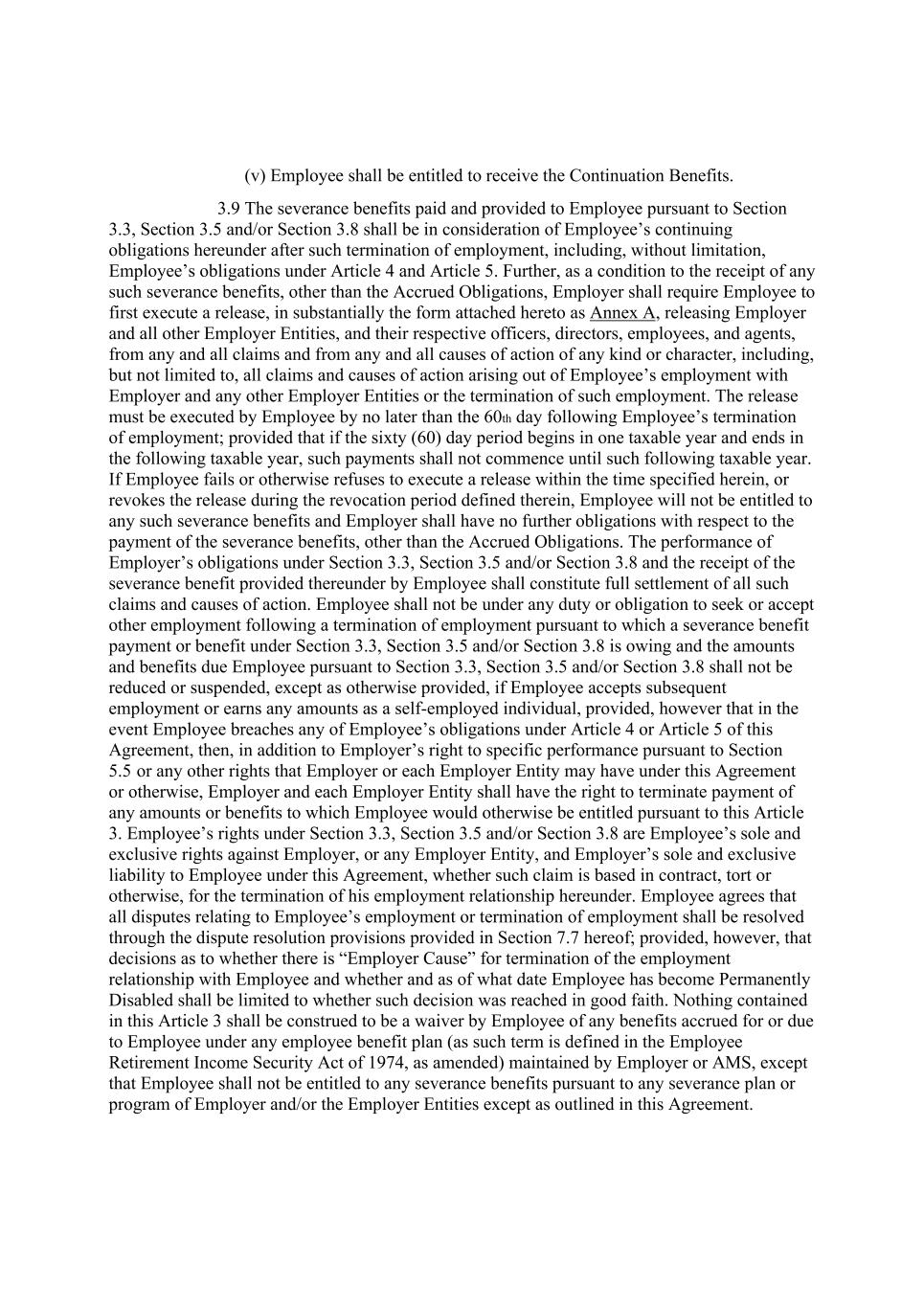 (v) Employee shall be entitled to receive the Continuation Benefits. 3.9 The severance benefits paid and provided to Employee pursuant to Section 3.3, Section 3.5 and/or Section 3.8 shall be in consideration of Employee’s continuing obligations hereunder after such termination of employment, including, without limitation, Employee’s obligations under Article 4 and Article 5. Further, as a condition to the receipt of any such severance benefits, other than the Accrued Obligations, Employer shall require Employee to first execute a release, in substantially the form attached hereto as Annex A, releasing Employer and all other Employer Entities, and their respective officers, directors, employees, and agents, from any and all claims and from any and all causes of action of any kind or character, including, but not limited to, all claims and causes of action arising out of Employee’s employment with Employer and any other Employer Entities or the termination of such employment. The release must be executed by Employee by no later than the 60th day following Employee’s termination of employment; provided that if the sixty (60) day period begins in one taxable year and ends in the following taxable year, such payments shall not commence until such following taxable year. If Employee fails or otherwise refuses to execute a release within the time specified herein, or revokes the release during the revocation period defined therein, Employee will not be entitled to any such severance benefits and Employer shall have no further obligations with respect to the payment of the severance benefits, other than the Accrued Obligations. The performance of Employer’s obligations under Section 3.3, Section 3.5 and/or Section 3.8 and the receipt of the severance benefit provided thereunder by Employee shall constitute full settlement of all such claims and causes of action. Employee shall not be under any duty or obligation to seek or accept other employment following a termination of employment pursuant to which a severance benefit payment or benefit under Section 3.3, Section 3.5 and/or Section 3.8 is owing and the amounts and benefits due Employee pursuant to Section 3.3, Section 3.5 and/or Section 3.8 shall not be reduced or suspended, except as otherwise provided, if Employee accepts subsequent employment or earns any amounts as a self-employed individual, provided, however that in the event Employee breaches any of Employee’s obligations under Article 4 or Article 5 of this Agreement, then, in addition to Employer’s right to specific performance pursuant to Section 5.5 or any other rights that Employer or each Employer Entity may have under this Agreement or otherwise, Employer and each Employer Entity shall have the right to terminate payment of any amounts or benefits to which Employee would otherwise be entitled pursuant to this Article 3. Employee’s rights under Section 3.3, Section 3.5 and/or Section 3.8 are Employee’s sole and exclusive rights against Employer, or any Employer Entity, and Employer’s sole and exclusive liability to Employee under this Agreement, whether such claim is based in contract, tort or otherwise, for the termination of his employment relationship hereunder. Employee agrees that all disputes relating to Employee’s employment or termination of employment shall be resolved through the dispute resolution provisions provided in Section 7.7 hereof; provided, however, that decisions as to whether there is “Employer Cause” for termination of the employment relationship with Employee and whether and as of what date Employee has become Permanently Disabled shall be limited to whether such decision was reached in good faith. Nothing contained in this Article 3 shall be construed to be a waiver by Employee of any benefits accrued for or due to Employee under any employee benefit plan (as such term is defined in the Employee Retirement Income Security Act of 1974, as amended) maintained by Employer or AMS, except that Employee shall not be entitled to any severance benefits pursuant to any severance plan or program of Employer and/or the Employer Entities except as outlined in this Agreement.