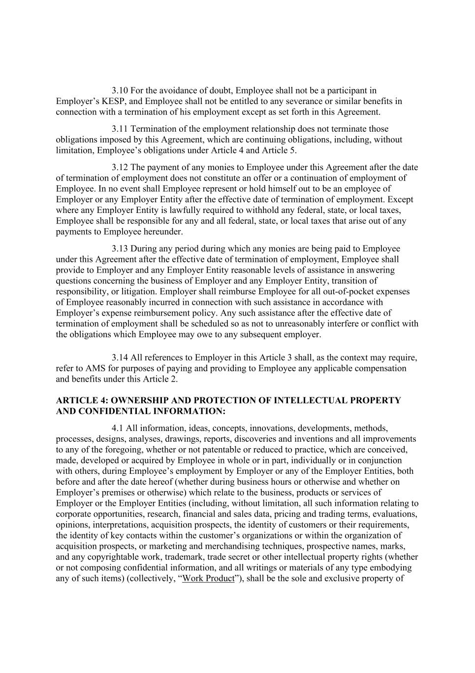 3.10 For the avoidance of doubt, Employee shall not be a participant in Employer’s KESP, and Employee shall not be entitled to any severance or similar benefits in connection with a termination of his employment except as set forth in this Agreement. 3.11 Termination of the employment relationship does not terminate those obligations imposed by this Agreement, which are continuing obligations, including, without limitation, Employee’s obligations under Article 4 and Article 5. 3.12 The payment of any monies to Employee under this Agreement after the date of termination of employment does not constitute an offer or a continuation of employment of Employee. In no event shall Employee represent or hold himself out to be an employee of Employer or any Employer Entity after the effective date of termination of employment. Except where any Employer Entity is lawfully required to withhold any federal, state, or local taxes, Employee shall be responsible for any and all federal, state, or local taxes that arise out of any payments to Employee hereunder. 3.13 During any period during which any monies are being paid to Employee under this Agreement after the effective date of termination of employment, Employee shall provide to Employer and any Employer Entity reasonable levels of assistance in answering questions concerning the business of Employer and any Employer Entity, transition of responsibility, or litigation. Employer shall reimburse Employee for all out-of-pocket expenses of Employee reasonably incurred in connection with such assistance in accordance with Employer’s expense reimbursement policy. Any such assistance after the effective date of termination of employment shall be scheduled so as not to unreasonably interfere or conflict with the obligations which Employee may owe to any subsequent employer. 3.14 All references to Employer in this Article 3 shall, as the context may require, refer to AMS for purposes of paying and providing to Employee any applicable compensation and benefits under this Article 2. ARTICLE 4: OWNERSHIP AND PROTECTION OF INTELLECTUAL PROPERTY AND CONFIDENTIAL INFORMATION: 4.1 All information, ideas, concepts, innovations, developments, methods, processes, designs, analyses, drawings, reports, discoveries and inventions and all improvements to any of the foregoing, whether or not patentable or reduced to practice, which are conceived, made, developed or acquired by Employee in whole or in part, individually or in conjunction with others, during Employee’s employment by Employer or any of the Employer Entities, both before and after the date hereof (whether during business hours or otherwise and whether on Employer’s premises or otherwise) which relate to the business, products or services of Employer or the Employer Entities (including, without limitation, all such information relating to corporate opportunities, research, financial and sales data, pricing and trading terms, evaluations, opinions, interpretations, acquisition prospects, the identity of customers or their requirements, the identity of key contacts within the customer’s organizations or within the organization of acquisition prospects, or marketing and merchandising techniques, prospective names, marks, and any copyrightable work, trademark, trade secret or other intellectual property rights (whether or not composing confidential information, and all writings or materials of any type embodying any of such items) (collectively, “Work Product”), shall be the sole and exclusive property of
