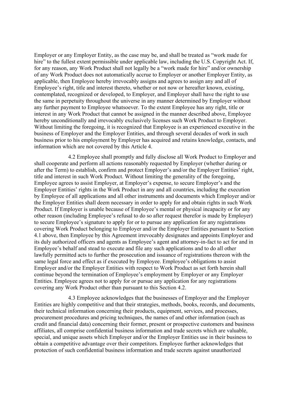 Employer or any Employer Entity, as the case may be, and shall be treated as “work made for hire” to the fullest extent permissible under applicable law, including the U.S. Copyright Act. If, for any reason, any Work Product shall not legally be a “work made for hire” and/or ownership of any Work Product does not automatically accrue to Employer or another Employer Entity, as applicable, then Employee hereby irrevocably assigns and agrees to assign any and all of Employee’s right, title and interest thereto, whether or not now or hereafter known, existing, contemplated, recognized or developed, to Employer, and Employer shall have the right to use the same in perpetuity throughout the universe in any manner determined by Employer without any further payment to Employee whatsoever. To the extent Employee has any right, title or interest in any Work Product that cannot be assigned in the manner described above, Employee hereby unconditionally and irrevocably exclusively licenses such Work Product to Employer. Without limiting the foregoing, it is recognized that Employee is an experienced executive in the business of Employer and the Employer Entities, and through several decades of work in such business prior to his employment by Employer has acquired and retains knowledge, contacts, and information which are not covered by this Article 4. 4.2 Employee shall promptly and fully disclose all Work Product to Employer and shall cooperate and perform all actions reasonably requested by Employer (whether during or after the Term) to establish, confirm and protect Employer’s and/or the Employer Entities’ right, title and interest in such Work Product. Without limiting the generality of the foregoing, Employee agrees to assist Employer, at Employer’s expense, to secure Employer’s and the Employer Entities’ rights in the Work Product in any and all countries, including the execution by Employee of all applications and all other instruments and documents which Employer and/or the Employer Entities shall deem necessary in order to apply for and obtain rights in such Work Product. If Employer is unable because of Employee’s mental or physical incapacity or for any other reason (including Employee’s refusal to do so after request therefor is made by Employer) to secure Employee’s signature to apply for or to pursue any application for any registrations covering Work Product belonging to Employer and/or the Employer Entities pursuant to Section 4.1 above, then Employee by this Agreement irrevocably designates and appoints Employer and its duly authorized officers and agents as Employee’s agent and attorney-in-fact to act for and in Employee’s behalf and stead to execute and file any such applications and to do all other lawfully permitted acts to further the prosecution and issuance of registrations thereon with the same legal force and effect as if executed by Employee. Employee’s obligations to assist Employer and/or the Employer Entities with respect to Work Product as set forth herein shall continue beyond the termination of Employee’s employment by Employer or any Employer Entities. Employee agrees not to apply for or pursue any application for any registrations covering any Work Product other than pursuant to this Section 4.2. 4.3 Employee acknowledges that the businesses of Employer and the Employer Entities are highly competitive and that their strategies, methods, books, records, and documents, their technical information concerning their products, equipment, services, and processes, procurement procedures and pricing techniques, the names of and other information (such as credit and financial data) concerning their former, present or prospective customers and business affiliates, all comprise confidential business information and trade secrets which are valuable, special, and unique assets which Employer and/or the Employer Entities use in their business to obtain a competitive advantage over their competitors. Employee further acknowledges that protection of such confidential business information and trade secrets against unauthorized