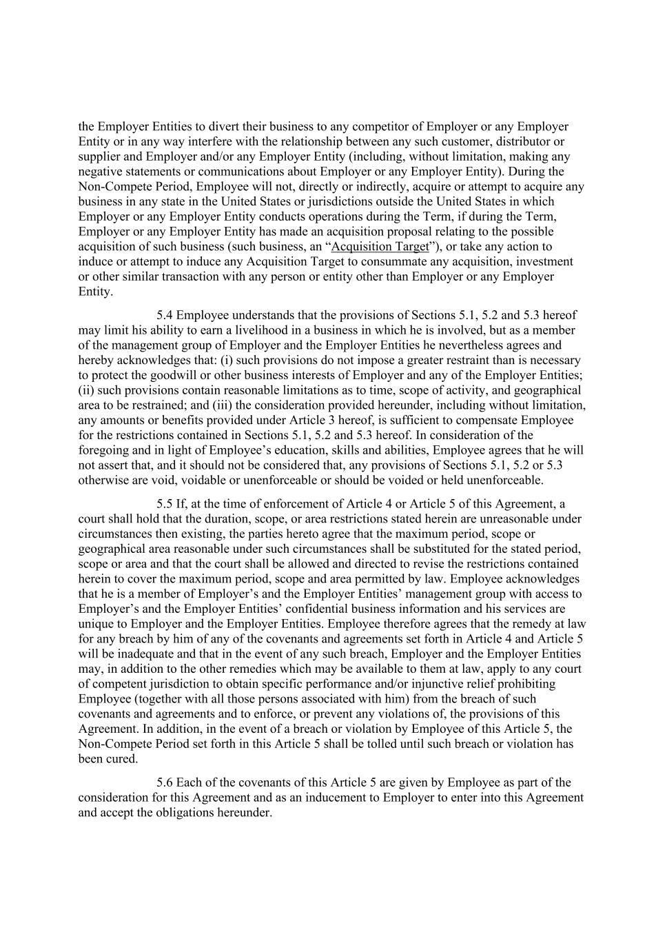the Employer Entities to divert their business to any competitor of Employer or any Employer Entity or in any way interfere with the relationship between any such customer, distributor or supplier and Employer and/or any Employer Entity (including, without limitation, making any negative statements or communications about Employer or any Employer Entity). During the Non-Compete Period, Employee will not, directly or indirectly, acquire or attempt to acquire any business in any state in the United States or jurisdictions outside the United States in which Employer or any Employer Entity conducts operations during the Term, if during the Term, Employer or any Employer Entity has made an acquisition proposal relating to the possible acquisition of such business (such business, an “Acquisition Target”), or take any action to induce or attempt to induce any Acquisition Target to consummate any acquisition, investment or other similar transaction with any person or entity other than Employer or any Employer Entity. 5.4 Employee understands that the provisions of Sections 5.1, 5.2 and 5.3 hereof may limit his ability to earn a livelihood in a business in which he is involved, but as a member of the management group of Employer and the Employer Entities he nevertheless agrees and hereby acknowledges that: (i) such provisions do not impose a greater restraint than is necessary to protect the goodwill or other business interests of Employer and any of the Employer Entities; (ii) such provisions contain reasonable limitations as to time, scope of activity, and geographical area to be restrained; and (iii) the consideration provided hereunder, including without limitation, any amounts or benefits provided under Article 3 hereof, is sufficient to compensate Employee for the restrictions contained in Sections 5.1, 5.2 and 5.3 hereof. In consideration of the foregoing and in light of Employee’s education, skills and abilities, Employee agrees that he will not assert that, and it should not be considered that, any provisions of Sections 5.1, 5.2 or 5.3 otherwise are void, voidable or unenforceable or should be voided or held unenforceable. 5.5 If, at the time of enforcement of Article 4 or Article 5 of this Agreement, a court shall hold that the duration, scope, or area restrictions stated herein are unreasonable under circumstances then existing, the parties hereto agree that the maximum period, scope or geographical area reasonable under such circumstances shall be substituted for the stated period, scope or area and that the court shall be allowed and directed to revise the restrictions contained herein to cover the maximum period, scope and area permitted by law. Employee acknowledges that he is a member of Employer’s and the Employer Entities’ management group with access to Employer’s and the Employer Entities’ confidential business information and his services are unique to Employer and the Employer Entities. Employee therefore agrees that the remedy at law for any breach by him of any of the covenants and agreements set forth in Article 4 and Article 5 will be inadequate and that in the event of any such breach, Employer and the Employer Entities may, in addition to the other remedies which may be available to them at law, apply to any court of competent jurisdiction to obtain specific performance and/or injunctive relief prohibiting Employee (together with all those persons associated with him) from the breach of such covenants and agreements and to enforce, or prevent any violations of, the provisions of this Agreement. In addition, in the event of a breach or violation by Employee of this Article 5, the Non-Compete Period set forth in this Article 5 shall be tolled until such breach or violation has been cured. 5.6 Each of the covenants of this Article 5 are given by Employee as part of the consideration for this Agreement and as an inducement to Employer to enter into this Agreement and accept the obligations hereunder.