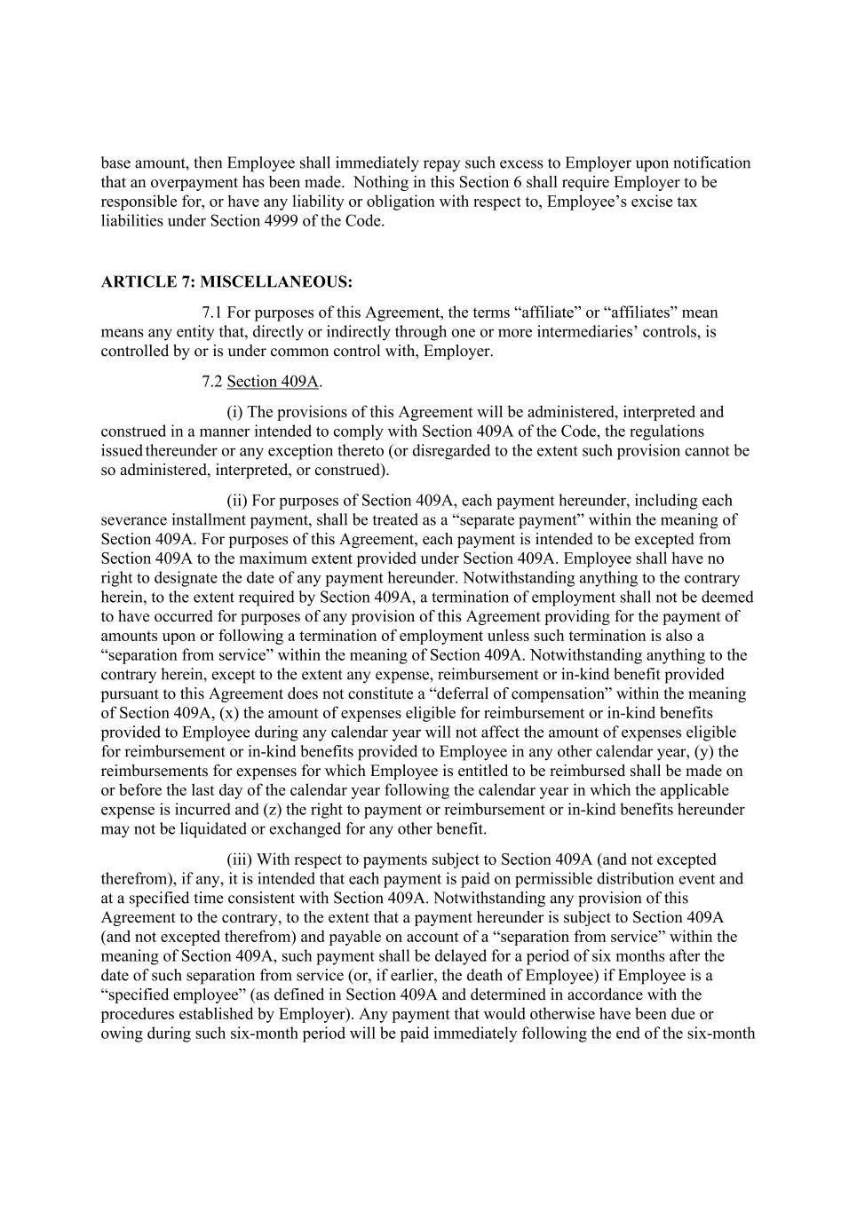 base amount, then Employee shall immediately repay such excess to Employer upon notification that an overpayment has been made. Nothing in this Section 6 shall require Employer to be responsible for, or have any liability or obligation with respect to, Employee’s excise tax liabilities under Section 4999 of the Code. ARTICLE 7: MISCELLANEOUS: 7.1 For purposes of this Agreement, the terms “affiliate” or “affiliates” mean means any entity that, directly or indirectly through one or more intermediaries’ controls, is controlled by or is under common control with, Employer. 7.2 Section 409A. (i) The provisions of this Agreement will be administered, interpreted and construed in a manner intended to comply with Section 409A of the Code, the regulations issued thereunder or any exception thereto (or disregarded to the extent such provision cannot be so administered, interpreted, or construed). (ii) For purposes of Section 409A, each payment hereunder, including each severance installment payment, shall be treated as a “separate payment” within the meaning of Section 409A. For purposes of this Agreement, each payment is intended to be excepted from Section 409A to the maximum extent provided under Section 409A. Employee shall have no right to designate the date of any payment hereunder. Notwithstanding anything to the contrary herein, to the extent required by Section 409A, a termination of employment shall not be deemed to have occurred for purposes of any provision of this Agreement providing for the payment of amounts upon or following a termination of employment unless such termination is also a “separation from service” within the meaning of Section 409A. Notwithstanding anything to the contrary herein, except to the extent any expense, reimbursement or in-kind benefit provided pursuant to this Agreement does not constitute a “deferral of compensation” within the meaning of Section 409A, (x) the amount of expenses eligible for reimbursement or in-kind benefits provided to Employee during any calendar year will not affect the amount of expenses eligible for reimbursement or in-kind benefits provided to Employee in any other calendar year, (y) the reimbursements for expenses for which Employee is entitled to be reimbursed shall be made on or before the last day of the calendar year following the calendar year in which the applicable expense is incurred and (z) the right to payment or reimbursement or in-kind benefits hereunder may not be liquidated or exchanged for any other benefit. (iii) With respect to payments subject to Section 409A (and not excepted therefrom), if any, it is intended that each payment is paid on permissible distribution event and at a specified time consistent with Section 409A. Notwithstanding any provision of this Agreement to the contrary, to the extent that a payment hereunder is subject to Section 409A (and not excepted therefrom) and payable on account of a “separation from service” within the meaning of Section 409A, such payment shall be delayed for a period of six months after the date of such separation from service (or, if earlier, the death of Employee) if Employee is a “specified employee” (as defined in Section 409A and determined in accordance with the procedures established by Employer). Any payment that would otherwise have been due or owing during such six-month period will be paid immediately following the end of the six-month