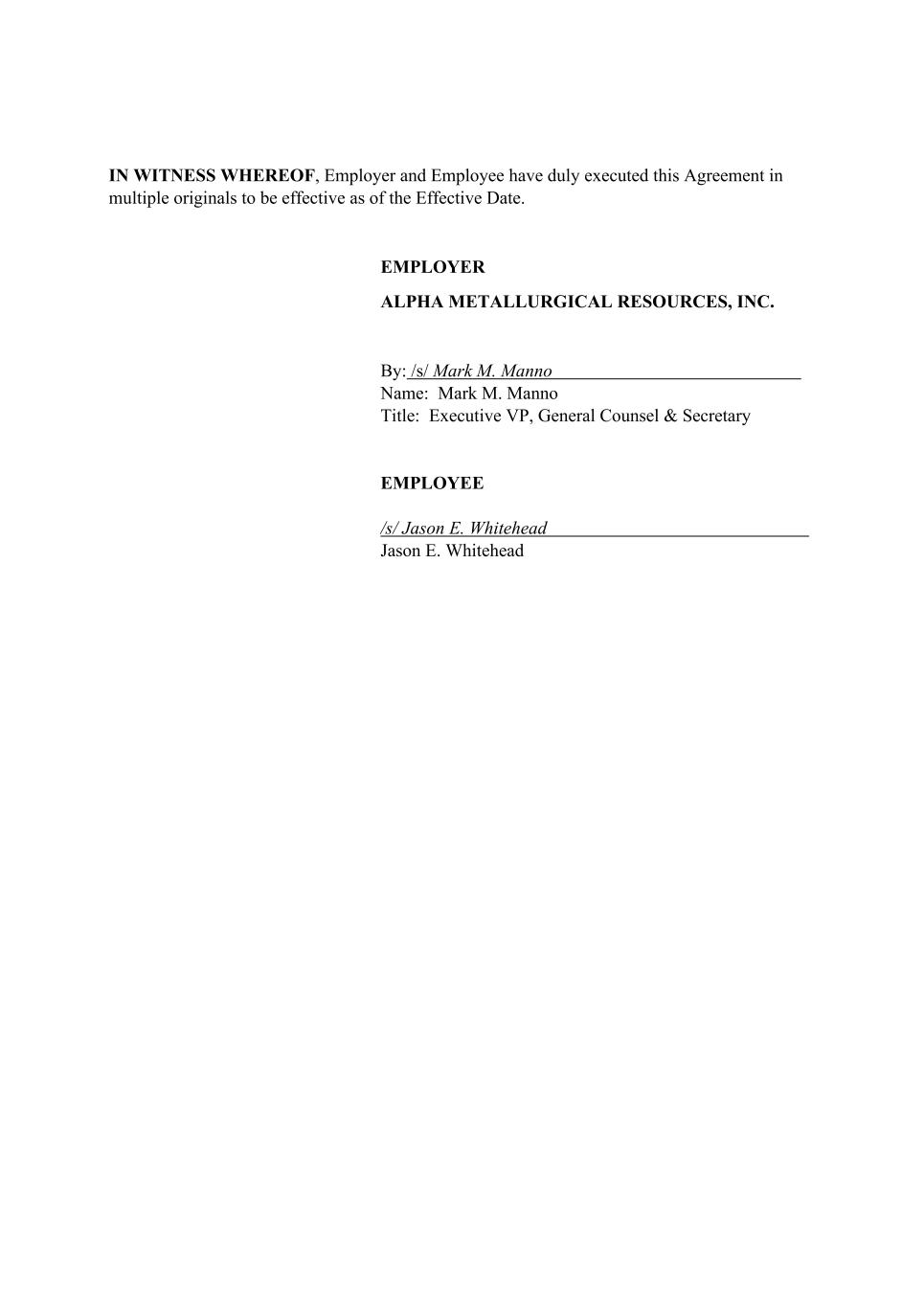 IN WITNESS WHEREOF, Employer and Employee have duly executed this Agreement in multiple originals to be effective as of the Effective Date. EMPLOYER ALPHA METALLURGICAL RESOURCES, INC. By: /s/ Mark M. Manno || Name: Mark M. Manno Title: Executive VP, General Counsel & Secretary EMPLOYEE /s/ Jason E. Whitehead | Jason E. Whitehead