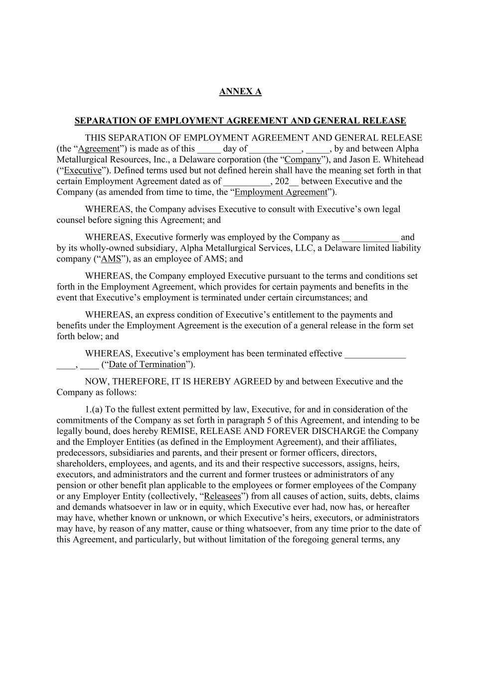 ANNEX A SEPARATION OF EMPLOYMENT AGREEMENT AND GENERAL RELEASE THIS SEPARATION OF EMPLOYMENT AGREEMENT AND GENERAL RELEASE (the “Agreement”) is made as of this _____ day of ___________, _____, by and between Alpha Metallurgical Resources, Inc., a Delaware corporation (the “Company”), and Jason E. Whitehead (“Executive”). Defined terms used but not defined herein shall have the meaning set forth in that certain Employment Agreement dated as of __________, 202__ between Executive and the Company (as amended from time to time, the “Employment Agreement”). WHEREAS, the Company advises Executive to consult with Executive’s own legal counsel before signing this Agreement; and WHEREAS, Executive formerly was employed by the Company as ____________ and by its wholly-owned subsidiary, Alpha Metallurgical Services, LLC, a Delaware limited liability company (“AMS”), as an employee of AMS; and WHEREAS, the Company employed Executive pursuant to the terms and conditions set forth in the Employment Agreement, which provides for certain payments and benefits in the event that Executive’s employment is terminated under certain circumstances; and WHEREAS, an express condition of Executive’s entitlement to the payments and benefits under the Employment Agreement is the execution of a general release in the form set forth below; and WHEREAS, Executive’s employment has been terminated effective _____________ ____, ____ (“Date of Termination”). NOW, THEREFORE, IT IS HEREBY AGREED by and between Executive and the Company as follows: 1.(a) To the fullest extent permitted by law, Executive, for and in consideration of the commitments of the Company as set forth in paragraph 5 of this Agreement, and intending to be legally bound, does hereby REMISE, RELEASE AND FOREVER DISCHARGE the Company and the Employer Entities (as defined in the Employment Agreement), and their affiliates, predecessors, subsidiaries and parents, and their present or former officers, directors, shareholders, employees, and agents, and its and their respective successors, assigns, heirs, executors, and administrators and the current and former trustees or administrators of any pension or other benefit plan applicable to the employees or former employees of the Company or any Employer Entity (collectively, “Releasees”) from all causes of action, suits, debts, claims and demands whatsoever in law or in equity, which Executive ever had, now has, or hereafter may have, whether known or unknown, or which Executive’s heirs, executors, or administrators may have, by reason of any matter, cause or thing whatsoever, from any time prior to the date of this Agreement, and particularly, but without limitation of the foregoing general terms, any