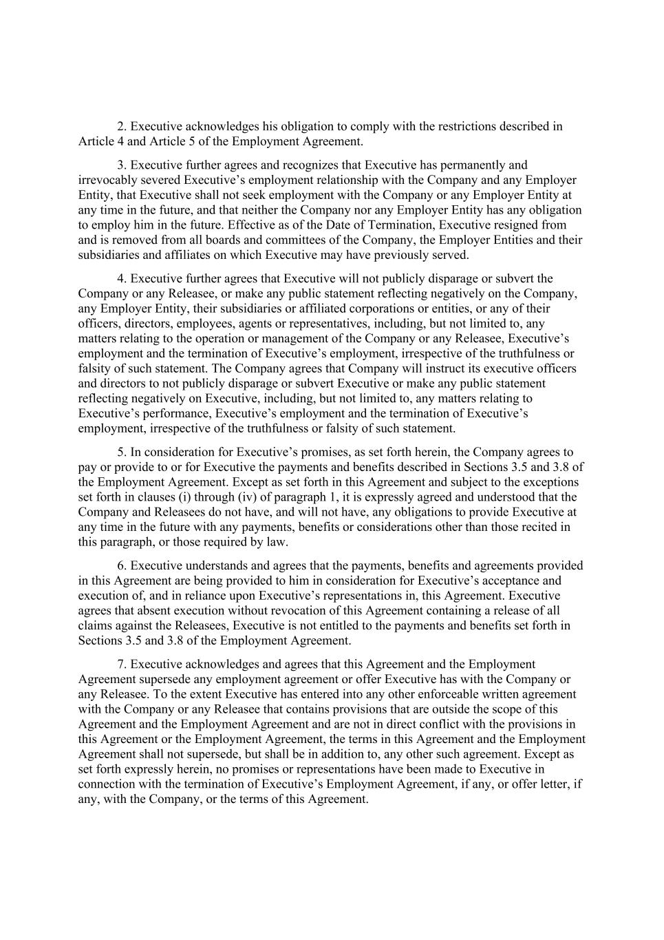 2. Executive acknowledges his obligation to comply with the restrictions described in Article 4 and Article 5 of the Employment Agreement. 3. Executive further agrees and recognizes that Executive has permanently and irrevocably severed Executive’s employment relationship with the Company and any Employer Entity, that Executive shall not seek employment with the Company or any Employer Entity at any time in the future, and that neither the Company nor any Employer Entity has any obligation to employ him in the future. Effective as of the Date of Termination, Executive resigned from and is removed from all boards and committees of the Company, the Employer Entities and their subsidiaries and affiliates on which Executive may have previously served. 4. Executive further agrees that Executive will not publicly disparage or subvert the Company or any Releasee, or make any public statement reflecting negatively on the Company, any Employer Entity, their subsidiaries or affiliated corporations or entities, or any of their officers, directors, employees, agents or representatives, including, but not limited to, any matters relating to the operation or management of the Company or any Releasee, Executive’s employment and the termination of Executive’s employment, irrespective of the truthfulness or falsity of such statement. The Company agrees that Company will instruct its executive officers and directors to not publicly disparage or subvert Executive or make any public statement reflecting negatively on Executive, including, but not limited to, any matters relating to Executive’s performance, Executive’s employment and the termination of Executive’s employment, irrespective of the truthfulness or falsity of such statement. 5. In consideration for Executive’s promises, as set forth herein, the Company agrees to pay or provide to or for Executive the payments and benefits described in Sections 3.5 and 3.8 of the Employment Agreement. Except as set forth in this Agreement and subject to the exceptions set forth in clauses (i) through (iv) of paragraph 1, it is expressly agreed and understood that the Company and Releasees do not have, and will not have, any obligations to provide Executive at any time in the future with any payments, benefits or considerations other than those recited in this paragraph, or those required by law. 6. Executive understands and agrees that the payments, benefits and agreements provided in this Agreement are being provided to him in consideration for Executive’s acceptance and execution of, and in reliance upon Executive’s representations in, this Agreement. Executive agrees that absent execution without revocation of this Agreement containing a release of all claims against the Releasees, Executive is not entitled to the payments and benefits set forth in Sections 3.5 and 3.8 of the Employment Agreement. 7. Executive acknowledges and agrees that this Agreement and the Employment Agreement supersede any employment agreement or offer Executive has with the Company or any Releasee. To the extent Executive has entered into any other enforceable written agreement with the Company or any Releasee that contains provisions that are outside the scope of this Agreement and the Employment Agreement and are not in direct conflict with the provisions in this Agreement or the Employment Agreement, the terms in this Agreement and the Employment Agreement shall not supersede, but shall be in addition to, any other such agreement. Except as set forth expressly herein, no promises or representations have been made to Executive in connection with the termination of Executive’s Employment Agreement, if any, or offer letter, if any, with the Company, or the terms of this Agreement.