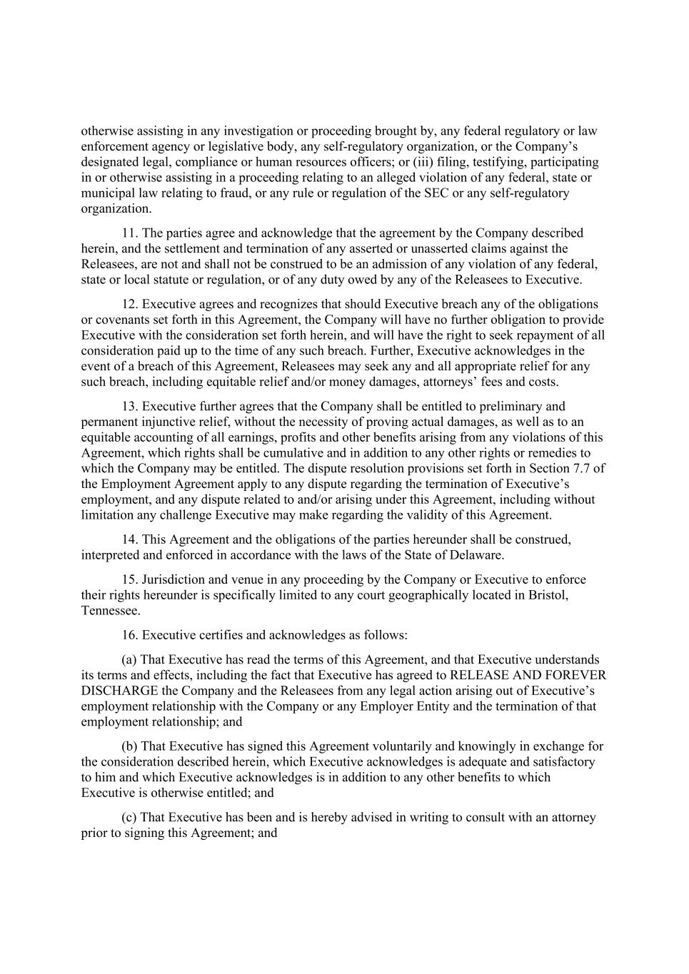 otherwise assisting in any investigation or proceeding brought by, any federal regulatory or law enforcement agency or legislative body, any self-regulatory organization, or the Company’s designated legal, compliance or human resources officers; or (iii) filing, testifying, participating in or otherwise assisting in a proceeding relating to an alleged violation of any federal, state or municipal law relating to fraud, or any rule or regulation of the SEC or any self-regulatory organization. 11. The parties agree and acknowledge that the agreement by the Company described herein, and the settlement and termination of any asserted or unasserted claims against the Releasees, are not and shall not be construed to be an admission of any violation of any federal, state or local statute or regulation, or of any duty owed by any of the Releasees to Executive. 12. Executive agrees and recognizes that should Executive breach any of the obligations or covenants set forth in this Agreement, the Company will have no further obligation to provide Executive with the consideration set forth herein, and will have the right to seek repayment of all consideration paid up to the time of any such breach. Further, Executive acknowledges in the event of a breach of this Agreement, Releasees may seek any and all appropriate relief for any such breach, including equitable relief and/or money damages, attorneys’ fees and costs. 13. Executive further agrees that the Company shall be entitled to preliminary and permanent injunctive relief, without the necessity of proving actual damages, as well as to an equitable accounting of all earnings, profits and other benefits arising from any violations of this Agreement, which rights shall be cumulative and in addition to any other rights or remedies to which the Company may be entitled. The dispute resolution provisions set forth in Section 7.7 of the Employment Agreement apply to any dispute regarding the termination of Executive’s employment, and any dispute related to and/or arising under this Agreement, including without limitation any challenge Executive may make regarding the validity of this Agreement. 14. This Agreement and the obligations of the parties hereunder shall be construed, interpreted and enforced in accordance with the laws of the State of Delaware. 15. Jurisdiction and venue in any proceeding by the Company or Executive to enforce their rights hereunder is specifically limited to any court geographically located in Bristol, Tennessee. 16. Executive certifies and acknowledges as follows: (a) That Executive has read the terms of this Agreement, and that Executive understands its terms and effects, including the fact that Executive has agreed to RELEASE AND FOREVER DISCHARGE the Company and the Releasees from any legal action arising out of Executive’s employment relationship with the Company or any Employer Entity and the termination of that employment relationship; and (b) That Executive has signed this Agreement voluntarily and knowingly in exchange for the consideration described herein, which Executive acknowledges is adequate and satisfactory to him and which Executive acknowledges is in addition to any other benefits to which Executive is otherwise entitled; and (c) That Executive has been and is hereby advised in writing to consult with an attorney prior to signing this Agreement; and