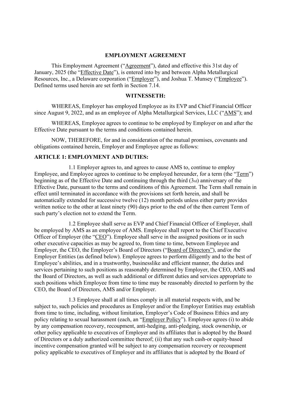 EMPLOYMENT AGREEMENT This Employment Agreement (“Agreement”), dated and effective this 31st day of January, 2025 (the “Effective Date”), is entered into by and between Alpha Metallurgical Resources, Inc., a Delaware corporation (“Employer”), and Joshua T. Munsey (“Employee”). Defined terms used herein are set forth in Section 7.14. WITNESSETH: WHEREAS, Employer has employed Employee as its EVP and Chief Financial Officer since August 9, 2022, and as an employee of Alpha Metallurgical Services, LLC (“AMS”); and WHEREAS, Employee agrees to continue to be employed by Employer on and after the Effective Date pursuant to the terms and conditions contained herein. NOW, THEREFORE, for and in consideration of the mutual promises, covenants and obligations contained herein, Employer and Employee agree as follows: ARTICLE 1: EMPLOYMENT AND DUTIES: 1.1 Employer agrees to, and agrees to cause AMS to, continue to employ Employee, and Employee agrees to continue to be employed hereunder, for a term (the “Term”) beginning as of the Effective Date and continuing through the third (3rd) anniversary of the Effective Date, pursuant to the terms and conditions of this Agreement. The Term shall remain in effect until terminated in accordance with the provisions set forth herein, and shall be automatically extended for successive twelve (12) month periods unless either party provides written notice to the other at least ninety (90) days prior to the end of the then current Term of such party’s election not to extend the Term. 1.2 Employee shall serve as EVP and Chief Financial Officer of Employer, shall be employed by AMS as an employee of AMS. Employee shall report to the Chief Executive Officer of Employer (the “CEO”). Employee shall serve in the assigned positions or in such other executive capacities as may be agreed to, from time to time, between Employee and Employer, the CEO, the Employer’s Board of Directors (“Board of Directors”), and/or the Employer Entities (as defined below). Employee agrees to perform diligently and to the best of Employee’s abilities, and in a trustworthy, businesslike and efficient manner, the duties and services pertaining to such positions as reasonably determined by Employer, the CEO, AMS and the Board of Directors, as well as such additional or different duties and services appropriate to such positions which Employee from time to time may be reasonably directed to perform by the CEO, the Board of Directors, AMS and/or Employer. 1.3 Employee shall at all times comply in all material respects with, and be subject to, such policies and procedures as Employer and/or the Employer Entities may establish from time to time, including, without limitation, Employer’s Code of Business Ethics and any policy relating to sexual harassment (each, an “Employer Policy”). Employee agrees (i) to abide by any compensation recovery, recoupment, anti-hedging, anti-pledging, stock ownership, or other policy applicable to executives of Employer and its affiliates that is adopted by the Board of Directors or a duly authorized committee thereof; (ii) that any such cash-or equity-based incentive compensation granted will be subject to any compensation recovery or recoupment policy applicable to executives of Employer and its affiliates that is adopted by the Board of