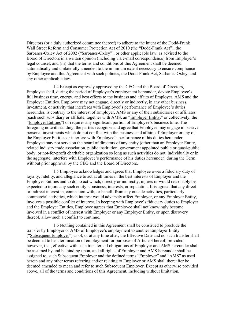 Directors (or a duly authorized committee thereof) to adhere to the intent of the Dodd-Frank Wall Street Reform and Consumer Protection Act of 2010 (the “Dodd-Frank Act”), the Sarbanes-Oxley Act of 2002 (“Sarbanes-Oxley”), or other applicable law, as advised to the Board of Directors in a written opinion (including via e-mail correspondence) from Employer’s legal counsel; and (iii) that the terms and conditions of this Agreement shall be deemed automatically and unilaterally amended to the minimum extent necessary to ensure compliance by Employee and this Agreement with such policies, the Dodd-Frank Act, Sarbanes-Oxley, and any other applicable law. 1.4 Except as expressly approved by the CEO and the Board of Directors, Employee shall, during the period of Employee’s employment hereunder, devote Employee’s full business time, energy, and best efforts to the business and affairs of Employer, AMS and the Employer Entities. Employee may not engage, directly or indirectly, in any other business, investment, or activity that interferes with Employee’s performance of Employee’s duties hereunder, is contrary to the interest of Employer, AMS or any of their subsidiaries or affiliates (each such subsidiary or affiliate, together with AMS, an “Employer Entity,” or collectively, the “Employer Entities”) or requires any significant portion of Employee’s business time. The foregoing notwithstanding, the parties recognize and agree that Employee may engage in passive personal investments which do not conflict with the business and affairs of Employer or any of the Employer Entities or interfere with Employee’s performance of his duties hereunder. Employee may not serve on the board of directors of any entity (other than an Employer Entity, related industry trade association, public institution, government appointed public or quasi-public body, or not-for-profit charitable organization so long as such activities do not, individually or in the aggregate, interfere with Employee’s performance of his duties hereunder) during the Term without prior approval by the CEO and the Board of Directors. 1.5 Employee acknowledges and agrees that Employee owes a fiduciary duty of loyalty, fidelity, and allegiance to act at all times in the best interests of Employer and the Employer Entities and to do no act which, directly or indirectly, injures or would reasonably be expected to injure any such entity’s business, interests, or reputation. It is agreed that any direct or indirect interest in, connection with, or benefit from any outside activities, particularly commercial activities, which interest would adversely affect Employer, or any Employer Entity, involves a possible conflict of interest. In keeping with Employee’s fiduciary duties to Employer and the Employer Entities, Employee agrees that Employee shall not knowingly become involved in a conflict of interest with Employer or any Employer Entity, or upon discovery thereof, allow such a conflict to continue. 1.6 Nothing contained in this Agreement shall be construed to preclude the transfer by Employer or AMS of Employee’s employment to another Employer Entity (“Subsequent Employer”) as of, or at any time after, the Effective Date and no such transfer shall be deemed to be a termination of employment for purposes of Article 3 hereof; provided, however, that, effective with such transfer, all obligations of Employer and AMS hereunder shall be assumed by and be binding upon, and all rights of Employer and AMS hereunder shall be assigned to, such Subsequent Employer and the defined terms “Employer” and “AMS” as used herein and any other terms referring and/or relating to Employer or AMS shall thereafter be deemed amended to mean and refer to such Subsequent Employer. Except as otherwise provided above, all of the terms and conditions of this Agreement, including without limitation,