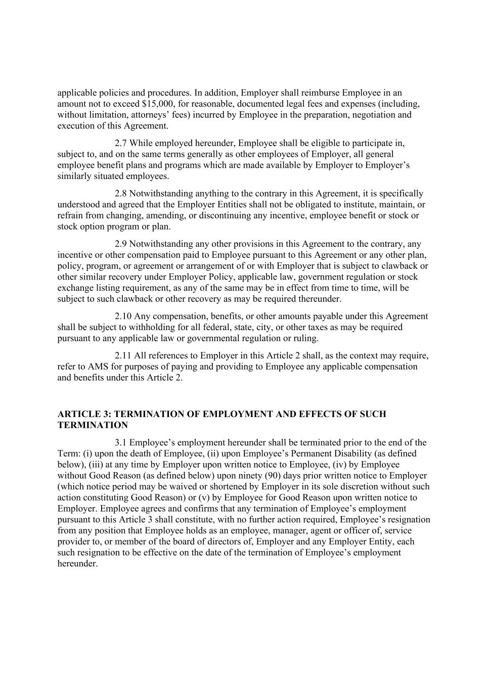 applicable policies and procedures. In addition, Employer shall reimburse Employee in an amount not to exceed $15,000, for reasonable, documented legal fees and expenses (including, without limitation, attorneys’ fees) incurred by Employee in the preparation, negotiation and execution of this Agreement. 2.7 While employed hereunder, Employee shall be eligible to participate in, subject to, and on the same terms generally as other employees of Employer, all general employee benefit plans and programs which are made available by Employer to Employer’s similarly situated employees. 2.8 Notwithstanding anything to the contrary in this Agreement, it is specifically understood and agreed that the Employer Entities shall not be obligated to institute, maintain, or refrain from changing, amending, or discontinuing any incentive, employee benefit or stock or stock option program or plan. 2.9 Notwithstanding any other provisions in this Agreement to the contrary, any incentive or other compensation paid to Employee pursuant to this Agreement or any other plan, policy, program, or agreement or arrangement of or with Employer that is subject to clawback or other similar recovery under Employer Policy, applicable law, government regulation or stock exchange listing requirement, as any of the same may be in effect from time to time, will be subject to such clawback or other recovery as may be required thereunder. 2.10 Any compensation, benefits, or other amounts payable under this Agreement shall be subject to withholding for all federal, state, city, or other taxes as may be required pursuant to any applicable law or governmental regulation or ruling. 2.11 All references to Employer in this Article 2 shall, as the context may require, refer to AMS for purposes of paying and providing to Employee any applicable compensation and benefits under this Article 2. ARTICLE 3: TERMINATION OF EMPLOYMENT AND EFFECTS OF SUCH TERMINATION 3.1 Employee’s employment hereunder shall be terminated prior to the end of the Term: (i) upon the death of Employee, (ii) upon Employee’s Permanent Disability (as defined below), (iii) at any time by Employer upon written notice to Employee, (iv) by Employee without Good Reason (as defined below) upon ninety (90) days prior written notice to Employer (which notice period may be waived or shortened by Employer in its sole discretion without such action constituting Good Reason) or (v) by Employee for Good Reason upon written notice to Employer. Employee agrees and confirms that any termination of Employee’s employment pursuant to this Article 3 shall constitute, with no further action required, Employee’s resignation from any position that Employee holds as an employee, manager, agent or officer of, service provider to, or member of the board of directors of, Employer and any Employer Entity, each such resignation to be effective on the date of the termination of Employee’s employment hereunder.