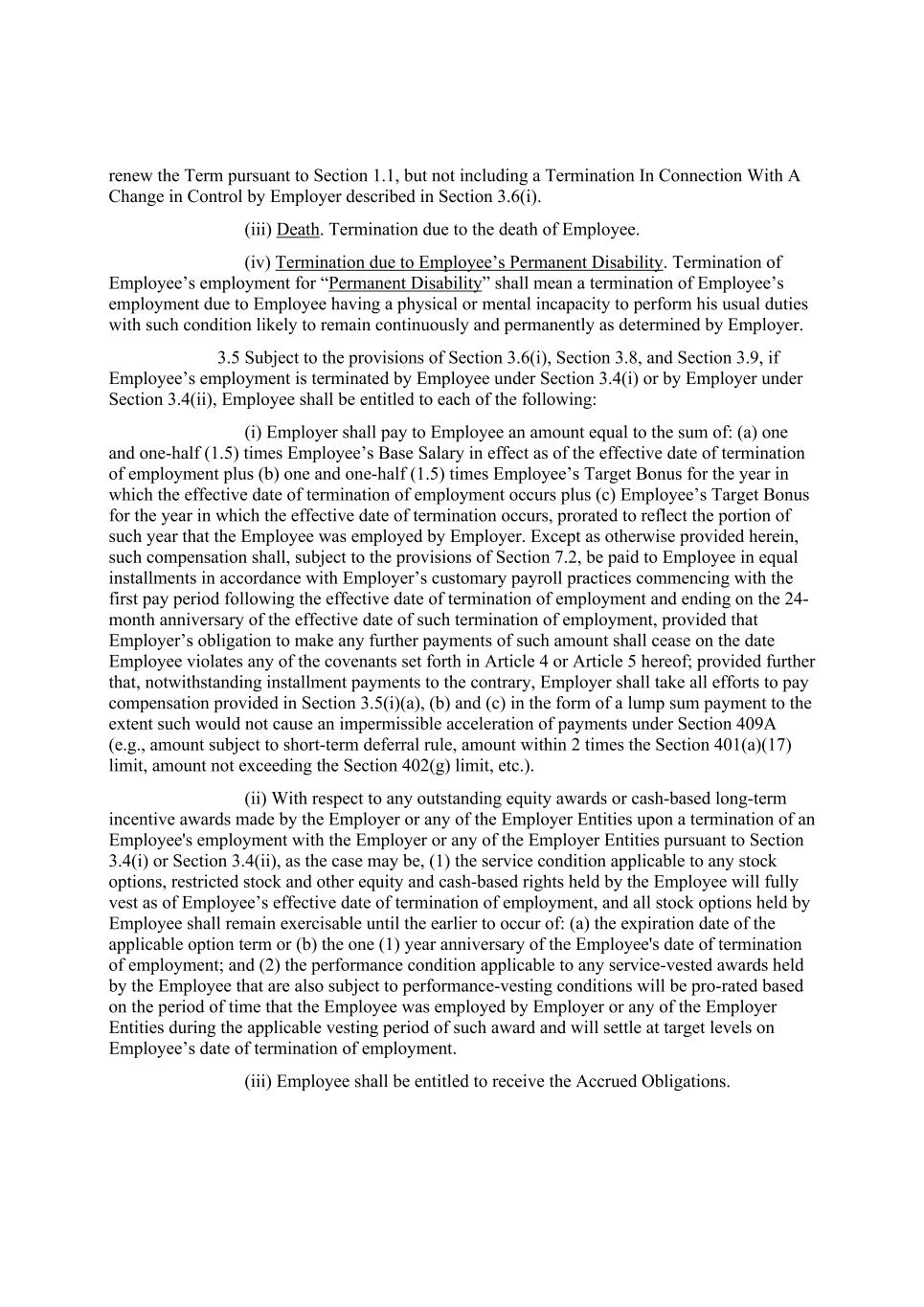 renew the Term pursuant to Section 1.1, but not including a Termination In Connection With A Change in Control by Employer described in Section 3.6(i). (iii) Death. Termination due to the death of Employee. (iv) Termination due to Employee’s Permanent Disability. Termination of Employee’s employment for “Permanent Disability” shall mean a termination of Employee’s employment due to Employee having a physical or mental incapacity to perform his usual duties with such condition likely to remain continuously and permanently as determined by Employer. 3.5 Subject to the provisions of Section 3.6(i), Section 3.8, and Section 3.9, if Employee’s employment is terminated by Employee under Section 3.4(i) or by Employer under Section 3.4(ii), Employee shall be entitled to each of the following: (i) Employer shall pay to Employee an amount equal to the sum of: (a) one and one-half (1.5) times Employee’s Base Salary in effect as of the effective date of termination of employment plus (b) one and one-half (1.5) times Employee’s Target Bonus for the year in which the effective date of termination of employment occurs plus (c) Employee’s Target Bonus for the year in which the effective date of termination occurs, prorated to reflect the portion of such year that the Employee was employed by Employer. Except as otherwise provided herein, such compensation shall, subject to the provisions of Section 7.2, be paid to Employee in equal installments in accordance with Employer’s customary payroll practices commencing with the first pay period following the effective date of termination of employment and ending on the 24- month anniversary of the effective date of such termination of employment, provided that Employer’s obligation to make any further payments of such amount shall cease on the date Employee violates any of the covenants set forth in Article 4 or Article 5 hereof; provided further that, notwithstanding installment payments to the contrary, Employer shall take all efforts to pay compensation provided in Section 3.5(i)(a), (b) and (c) in the form of a lump sum payment to the extent such would not cause an impermissible acceleration of payments under Section 409A (e.g., amount subject to short-term deferral rule, amount within 2 times the Section 401(a)(17) limit, amount not exceeding the Section 402(g) limit, etc.). (ii) With respect to any outstanding equity awards or cash-based long-term incentive awards made by the Employer or any of the Employer Entities upon a termination of an Employee's employment with the Employer or any of the Employer Entities pursuant to Section 3.4(i) or Section 3.4(ii), as the case may be, (1) the service condition applicable to any stock options, restricted stock and other equity and cash-based rights held by the Employee will fully vest as of Employee’s effective date of termination of employment, and all stock options held by Employee shall remain exercisable until the earlier to occur of: (a) the expiration date of the applicable option term or (b) the one (1) year anniversary of the Employee's date of termination of employment; and (2) the performance condition applicable to any service-vested awards held by the Employee that are also subject to performance-vesting conditions will be pro-rated based on the period of time that the Employee was employed by Employer or any of the Employer Entities during the applicable vesting period of such award and will settle at target levels on Employee’s date of termination of employment. (iii) Employee shall be entitled to receive the Accrued Obligations.