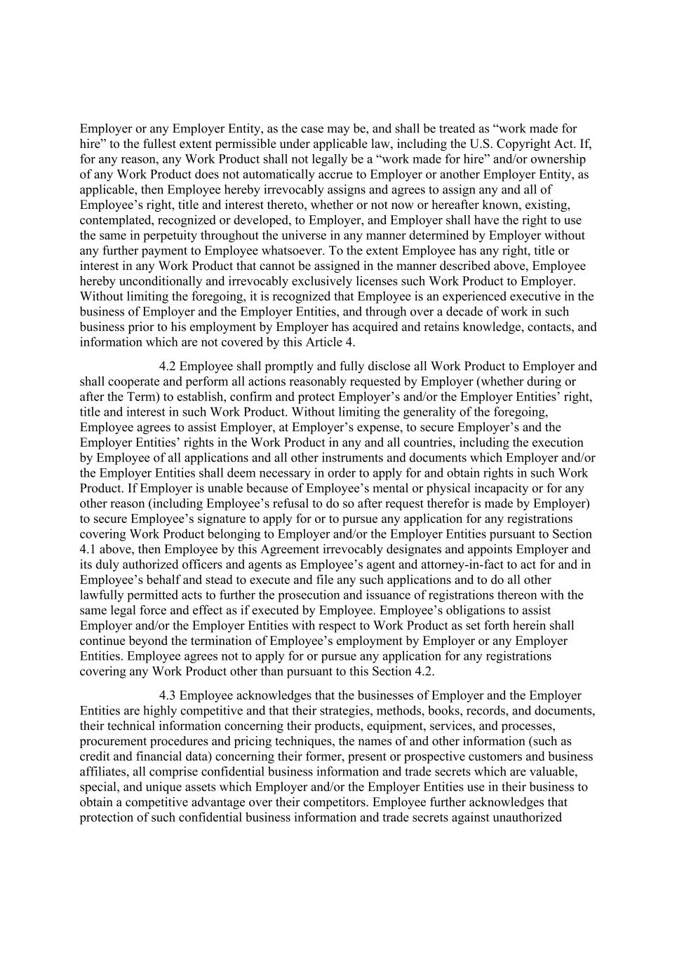 Employer or any Employer Entity, as the case may be, and shall be treated as “work made for hire” to the fullest extent permissible under applicable law, including the U.S. Copyright Act. If, for any reason, any Work Product shall not legally be a “work made for hire” and/or ownership of any Work Product does not automatically accrue to Employer or another Employer Entity, as applicable, then Employee hereby irrevocably assigns and agrees to assign any and all of Employee’s right, title and interest thereto, whether or not now or hereafter known, existing, contemplated, recognized or developed, to Employer, and Employer shall have the right to use the same in perpetuity throughout the universe in any manner determined by Employer without any further payment to Employee whatsoever. To the extent Employee has any right, title or interest in any Work Product that cannot be assigned in the manner described above, Employee hereby unconditionally and irrevocably exclusively licenses such Work Product to Employer. Without limiting the foregoing, it is recognized that Employee is an experienced executive in the business of Employer and the Employer Entities, and through over a decade of work in such business prior to his employment by Employer has acquired and retains knowledge, contacts, and information which are not covered by this Article 4. 4.2 Employee shall promptly and fully disclose all Work Product to Employer and shall cooperate and perform all actions reasonably requested by Employer (whether during or after the Term) to establish, confirm and protect Employer’s and/or the Employer Entities’ right, title and interest in such Work Product. Without limiting the generality of the foregoing, Employee agrees to assist Employer, at Employer’s expense, to secure Employer’s and the Employer Entities’ rights in the Work Product in any and all countries, including the execution by Employee of all applications and all other instruments and documents which Employer and/or the Employer Entities shall deem necessary in order to apply for and obtain rights in such Work Product. If Employer is unable because of Employee’s mental or physical incapacity or for any other reason (including Employee’s refusal to do so after request therefor is made by Employer) to secure Employee’s signature to apply for or to pursue any application for any registrations covering Work Product belonging to Employer and/or the Employer Entities pursuant to Section 4.1 above, then Employee by this Agreement irrevocably designates and appoints Employer and its duly authorized officers and agents as Employee’s agent and attorney-in-fact to act for and in Employee’s behalf and stead to execute and file any such applications and to do all other lawfully permitted acts to further the prosecution and issuance of registrations thereon with the same legal force and effect as if executed by Employee. Employee’s obligations to assist Employer and/or the Employer Entities with respect to Work Product as set forth herein shall continue beyond the termination of Employee’s employment by Employer or any Employer Entities. Employee agrees not to apply for or pursue any application for any registrations covering any Work Product other than pursuant to this Section 4.2. 4.3 Employee acknowledges that the businesses of Employer and the Employer Entities are highly competitive and that their strategies, methods, books, records, and documents, their technical information concerning their products, equipment, services, and processes, procurement procedures and pricing techniques, the names of and other information (such as credit and financial data) concerning their former, present or prospective customers and business affiliates, all comprise confidential business information and trade secrets which are valuable, special, and unique assets which Employer and/or the Employer Entities use in their business to obtain a competitive advantage over their competitors. Employee further acknowledges that protection of such confidential business information and trade secrets against unauthorized