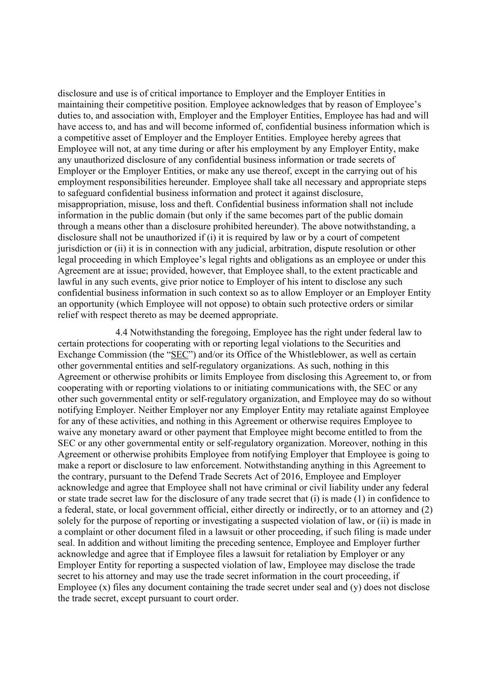 disclosure and use is of critical importance to Employer and the Employer Entities in maintaining their competitive position. Employee acknowledges that by reason of Employee’s duties to, and association with, Employer and the Employer Entities, Employee has had and will have access to, and has and will become informed of, confidential business information which is a competitive asset of Employer and the Employer Entities. Employee hereby agrees that Employee will not, at any time during or after his employment by any Employer Entity, make any unauthorized disclosure of any confidential business information or trade secrets of Employer or the Employer Entities, or make any use thereof, except in the carrying out of his employment responsibilities hereunder. Employee shall take all necessary and appropriate steps to safeguard confidential business information and protect it against disclosure, misappropriation, misuse, loss and theft. Confidential business information shall not include information in the public domain (but only if the same becomes part of the public domain through a means other than a disclosure prohibited hereunder). The above notwithstanding, a disclosure shall not be unauthorized if (i) it is required by law or by a court of competent jurisdiction or (ii) it is in connection with any judicial, arbitration, dispute resolution or other legal proceeding in which Employee’s legal rights and obligations as an employee or under this Agreement are at issue; provided, however, that Employee shall, to the extent practicable and lawful in any such events, give prior notice to Employer of his intent to disclose any such confidential business information in such context so as to allow Employer or an Employer Entity an opportunity (which Employee will not oppose) to obtain such protective orders or similar relief with respect thereto as may be deemed appropriate. 4.4 Notwithstanding the foregoing, Employee has the right under federal law to certain protections for cooperating with or reporting legal violations to the Securities and Exchange Commission (the “SEC”) and/or its Office of the Whistleblower, as well as certain other governmental entities and self-regulatory organizations. As such, nothing in this Agreement or otherwise prohibits or limits Employee from disclosing this Agreement to, or from cooperating with or reporting violations to or initiating communications with, the SEC or any other such governmental entity or self-regulatory organization, and Employee may do so without notifying Employer. Neither Employer nor any Employer Entity may retaliate against Employee for any of these activities, and nothing in this Agreement or otherwise requires Employee to waive any monetary award or other payment that Employee might become entitled to from the SEC or any other governmental entity or self-regulatory organization. Moreover, nothing in this Agreement or otherwise prohibits Employee from notifying Employer that Employee is going to make a report or disclosure to law enforcement. Notwithstanding anything in this Agreement to the contrary, pursuant to the Defend Trade Secrets Act of 2016, Employee and Employer acknowledge and agree that Employee shall not have criminal or civil liability under any federal or state trade secret law for the disclosure of any trade secret that (i) is made (1) in confidence to a federal, state, or local government official, either directly or indirectly, or to an attorney and (2) solely for the purpose of reporting or investigating a suspected violation of law, or (ii) is made in a complaint or other document filed in a lawsuit or other proceeding, if such filing is made under seal. In addition and without limiting the preceding sentence, Employee and Employer further acknowledge and agree that if Employee files a lawsuit for retaliation by Employer or any Employer Entity for reporting a suspected violation of law, Employee may disclose the trade secret to his attorney and may use the trade secret information in the court proceeding, if Employee (x) files any document containing the trade secret under seal and (y) does not disclose the trade secret, except pursuant to court order.