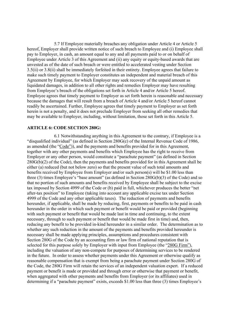 5.7 If Employee materially breaches any obligation under Article 4 or Article 5 hereof, Employer shall provide written notice of such breach to Employee and (i) Employee shall pay to Employer, in cash, an amount equal to any and all payments paid to or on behalf of Employee under Article 3 of this Agreement and (ii) any equity or equity-based awards that are unvested as of the date of such breach or were entitled to accelerated vesting under Section 3.5(ii) or 3.8(ii) shall be immediately forfeited in their entirety. Employee agrees that failure to make such timely payment to Employer constitutes an independent and material breach of this Agreement by Employee, for which Employer may seek recovery of the unpaid amount as liquidated damages, in addition to all other rights and remedies Employer may have resulting from Employee’s breach of the obligations set forth in Article 4 and/or Article 5 hereof. Employee agrees that timely payment to Employer as set forth herein is reasonable and necessary because the damages that will result from a breach of Article 4 and/or Article 5 hereof cannot readily be ascertained. Further, Employee agrees that timely payment to Employer as set forth herein is not a penalty, and it does not preclude Employer from seeking all other remedies that may be available to Employer, including, without limitation, those set forth in this Article 5. ARTICLE 6: CODE SECTION 280G: 6.1 Notwithstanding anything in this Agreement to the contrary, if Employee is a “disqualified individual” (as defined in Section 280G(c) of the Internal Revenue Code of 1986, as amended (the “Code”)), and the payments and benefits provided for in this Agreement, together with any other payments and benefits which Employee has the right to receive from Employer or any other person, would constitute a “parachute payment” (as defined in Section 280G(b)(2) of the Code), then the payments and benefits provided for in this Agreement shall be either (a) reduced (but not below zero) so that the present value of such total amounts and benefits received by Employee from Employer and/or such person(s) will be $1.00 less than three (3) times Employee’s “base amount” (as defined in Section 280G(b)(3) of the Code) and so that no portion of such amounts and benefits received by Employee shall be subject to the excise tax imposed by Section 4999 of the Code or (b) paid in full, whichever produces the better “net after-tax position” to Employee (taking into account any applicable excise tax under Section 4999 of the Code and any other applicable taxes). The reduction of payments and benefits hereunder, if applicable, shall be made by reducing, first, payments or benefits to be paid in cash hereunder in the order in which such payment or benefit would be paid or provided (beginning with such payment or benefit that would be made last in time and continuing, to the extent necessary, through to such payment or benefit that would be made first in time) and, then, reducing any benefit to be provided in-kind hereunder in a similar order. The determination as to whether any such reduction in the amount of the payments and benefits provided hereunder is necessary shall be made applying principles, assumptions and procedures consistent with Section 280G of the Code by an accounting firm or law firm of national reputation that is selected for this purpose solely by Employer with input from Employee (the “280G Firm”), including the valuation of any non-compete for purposes of determining services to be rendered in the future. In order to assess whether payments under this Agreement or otherwise qualify as reasonable compensation that is exempt from being a parachute payment under Section 280G of the Code, the 280G Firm will retain the services of an independent valuation expert. If a reduced payment or benefit is made or provided and through error or otherwise that payment or benefit, when aggregated with other payments and benefits from Employer (or its affiliates) used in determining if a “parachute payment” exists, exceeds $1.00 less than three (3) times Employee’s