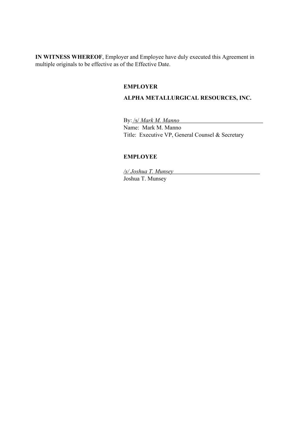 IN WITNESS WHEREOF, Employer and Employee have duly executed this Agreement in multiple originals to be effective as of the Effective Date. EMPLOYER ALPHA METALLURGICAL RESOURCES, INC. By: /s/ Mark M. Manno | Name: Mark M. Manno Title: Executive VP, General Counsel & Secretary EMPLOYEE /s/ Joshua T. Munsey | Joshua T. Munsey