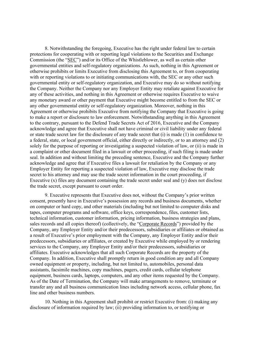 8. Notwithstanding the foregoing, Executive has the right under federal law to certain protections for cooperating with or reporting legal violations to the Securities and Exchange Commission (the “SEC”) and/or its Office of the Whistleblower, as well as certain other governmental entities and self-regulatory organizations. As such, nothing in this Agreement or otherwise prohibits or limits Executive from disclosing this Agreement to, or from cooperating with or reporting violations to or initiating communications with, the SEC or any other such governmental entity or self-regulatory organization, and Executive may do so without notifying the Company. Neither the Company nor any Employer Entity may retaliate against Executive for any of these activities, and nothing in this Agreement or otherwise requires Executive to waive any monetary award or other payment that Executive might become entitled to from the SEC or any other governmental entity or self-regulatory organization. Moreover, nothing in this Agreement or otherwise prohibits Executive from notifying the Company that Executive is going to make a report or disclosure to law enforcement. Notwithstanding anything in this Agreement to the contrary, pursuant to the Defend Trade Secrets Act of 2016, Executive and the Company acknowledge and agree that Executive shall not have criminal or civil liability under any federal or state trade secret law for the disclosure of any trade secret that (i) is made (1) in confidence to a federal, state, or local government official, either directly or indirectly, or to an attorney and (2) solely for the purpose of reporting or investigating a suspected violation of law, or (ii) is made in a complaint or other document filed in a lawsuit or other proceeding, if such filing is made under seal. In addition and without limiting the preceding sentence, Executive and the Company further acknowledge and agree that if Executive files a lawsuit for retaliation by the Company or any Employer Entity for reporting a suspected violation of law, Executive may disclose the trade secret to his attorney and may use the trade secret information in the court proceeding, if Executive (x) files any document containing the trade secret under seal and (y) does not disclose the trade secret, except pursuant to court order. 9. Executive represents that Executive does not, without the Company’s prior written consent, presently have in Executive’s possession any records and business documents, whether on computer or hard copy, and other materials (including but not limited to computer disks and tapes, computer programs and software, office keys, correspondence, files, customer lists, technical information, customer information, pricing information, business strategies and plans, sales records and all copies thereof) (collectively, the “Corporate Records”) provided by the Company, any Employer Entity and/or their predecessors, subsidiaries or affiliates or obtained as a result of Executive’s prior employment with the Company, any Employer Entity and/or their predecessors, subsidiaries or affiliates, or created by Executive while employed by or rendering services to the Company, any Employer Entity and/or their predecessors, subsidiaries or affiliates. Executive acknowledges that all such Corporate Records are the property of the Company. In addition, Executive shall promptly return in good condition any and all Company owned equipment or property, including, but not limited to, automobiles, personal data assistants, facsimile machines, copy machines, pagers, credit cards, cellular telephone equipment, business cards, laptops, computers, and any other items requested by the Company. As of the Date of Termination, the Company will make arrangements to remove, terminate or transfer any and all business communication lines including network access, cellular phone, fax line and other business numbers. 10. Nothing in this Agreement shall prohibit or restrict Executive from: (i) making any disclosure of information required by law; (ii) providing information to, or testifying or