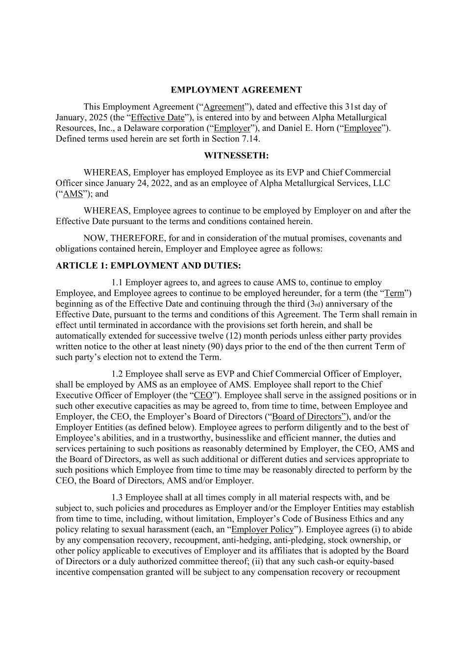 EMPLOYMENT AGREEMENT This Employment Agreement (“Agreement”), dated and effective this 31st day of January, 2025 (the “Effective Date”), is entered into by and between Alpha Metallurgical Resources, Inc., a Delaware corporation (“Employer”), and Daniel E. Horn (“Employee”). Defined terms used herein are set forth in Section 7.14. WITNESSETH: WHEREAS, Employer has employed Employee as its EVP and Chief Commercial Officer since January 24, 2022, and as an employee of Alpha Metallurgical Services, LLC (“AMS”); and WHEREAS, Employee agrees to continue to be employed by Employer on and after the Effective Date pursuant to the terms and conditions contained herein. NOW, THEREFORE, for and in consideration of the mutual promises, covenants and obligations contained herein, Employer and Employee agree as follows: ARTICLE 1: EMPLOYMENT AND DUTIES: 1.1 Employer agrees to, and agrees to cause AMS to, continue to employ Employee, and Employee agrees to continue to be employed hereunder, for a term (the “Term”) beginning as of the Effective Date and continuing through the third (3rd) anniversary of the Effective Date, pursuant to the terms and conditions of this Agreement. The Term shall remain in effect until terminated in accordance with the provisions set forth herein, and shall be automatically extended for successive twelve (12) month periods unless either party provides written notice to the other at least ninety (90) days prior to the end of the then current Term of such party’s election not to extend the Term. 1.2 Employee shall serve as EVP and Chief Commercial Officer of Employer, shall be employed by AMS as an employee of AMS. Employee shall report to the Chief Executive Officer of Employer (the “CEO”). Employee shall serve in the assigned positions or in such other executive capacities as may be agreed to, from time to time, between Employee and Employer, the CEO, the Employer’s Board of Directors (“Board of Directors”), and/or the Employer Entities (as defined below). Employee agrees to perform diligently and to the best of Employee’s abilities, and in a trustworthy, businesslike and efficient manner, the duties and services pertaining to such positions as reasonably determined by Employer, the CEO, AMS and the Board of Directors, as well as such additional or different duties and services appropriate to such positions which Employee from time to time may be reasonably directed to perform by the CEO, the Board of Directors, AMS and/or Employer. 1.3 Employee shall at all times comply in all material respects with, and be subject to, such policies and procedures as Employer and/or the Employer Entities may establish from time to time, including, without limitation, Employer’s Code of Business Ethics and any policy relating to sexual harassment (each, an “Employer Policy”). Employee agrees (i) to abide by any compensation recovery, recoupment, anti-hedging, anti-pledging, stock ownership, or other policy applicable to executives of Employer and its affiliates that is adopted by the Board of Directors or a duly authorized committee thereof; (ii) that any such cash-or equity-based incentive compensation granted will be subject to any compensation recovery or recoupment