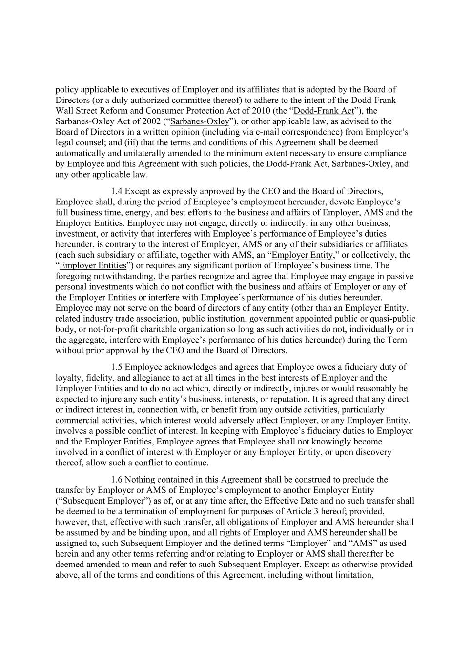 policy applicable to executives of Employer and its affiliates that is adopted by the Board of Directors (or a duly authorized committee thereof) to adhere to the intent of the Dodd-Frank Wall Street Reform and Consumer Protection Act of 2010 (the “Dodd-Frank Act”), the Sarbanes-Oxley Act of 2002 (“Sarbanes-Oxley”), or other applicable law, as advised to the Board of Directors in a written opinion (including via e-mail correspondence) from Employer’s legal counsel; and (iii) that the terms and conditions of this Agreement shall be deemed automatically and unilaterally amended to the minimum extent necessary to ensure compliance by Employee and this Agreement with such policies, the Dodd-Frank Act, Sarbanes-Oxley, and any other applicable law. 1.4 Except as expressly approved by the CEO and the Board of Directors, Employee shall, during the period of Employee’s employment hereunder, devote Employee’s full business time, energy, and best efforts to the business and affairs of Employer, AMS and the Employer Entities. Employee may not engage, directly or indirectly, in any other business, investment, or activity that interferes with Employee’s performance of Employee’s duties hereunder, is contrary to the interest of Employer, AMS or any of their subsidiaries or affiliates (each such subsidiary or affiliate, together with AMS, an “Employer Entity,” or collectively, the “Employer Entities”) or requires any significant portion of Employee’s business time. The foregoing notwithstanding, the parties recognize and agree that Employee may engage in passive personal investments which do not conflict with the business and affairs of Employer or any of the Employer Entities or interfere with Employee’s performance of his duties hereunder. Employee may not serve on the board of directors of any entity (other than an Employer Entity, related industry trade association, public institution, government appointed public or quasi-public body, or not-for-profit charitable organization so long as such activities do not, individually or in the aggregate, interfere with Employee’s performance of his duties hereunder) during the Term without prior approval by the CEO and the Board of Directors. 1.5 Employee acknowledges and agrees that Employee owes a fiduciary duty of loyalty, fidelity, and allegiance to act at all times in the best interests of Employer and the Employer Entities and to do no act which, directly or indirectly, injures or would reasonably be expected to injure any such entity’s business, interests, or reputation. It is agreed that any direct or indirect interest in, connection with, or benefit from any outside activities, particularly commercial activities, which interest would adversely affect Employer, or any Employer Entity, involves a possible conflict of interest. In keeping with Employee’s fiduciary duties to Employer and the Employer Entities, Employee agrees that Employee shall not knowingly become involved in a conflict of interest with Employer or any Employer Entity, or upon discovery thereof, allow such a conflict to continue. 1.6 Nothing contained in this Agreement shall be construed to preclude the transfer by Employer or AMS of Employee’s employment to another Employer Entity (“Subsequent Employer”) as of, or at any time after, the Effective Date and no such transfer shall be deemed to be a termination of employment for purposes of Article 3 hereof; provided, however, that, effective with such transfer, all obligations of Employer and AMS hereunder shall be assumed by and be binding upon, and all rights of Employer and AMS hereunder shall be assigned to, such Subsequent Employer and the defined terms “Employer” and “AMS” as used herein and any other terms referring and/or relating to Employer or AMS shall thereafter be deemed amended to mean and refer to such Subsequent Employer. Except as otherwise provided above, all of the terms and conditions of this Agreement, including without limitation,
