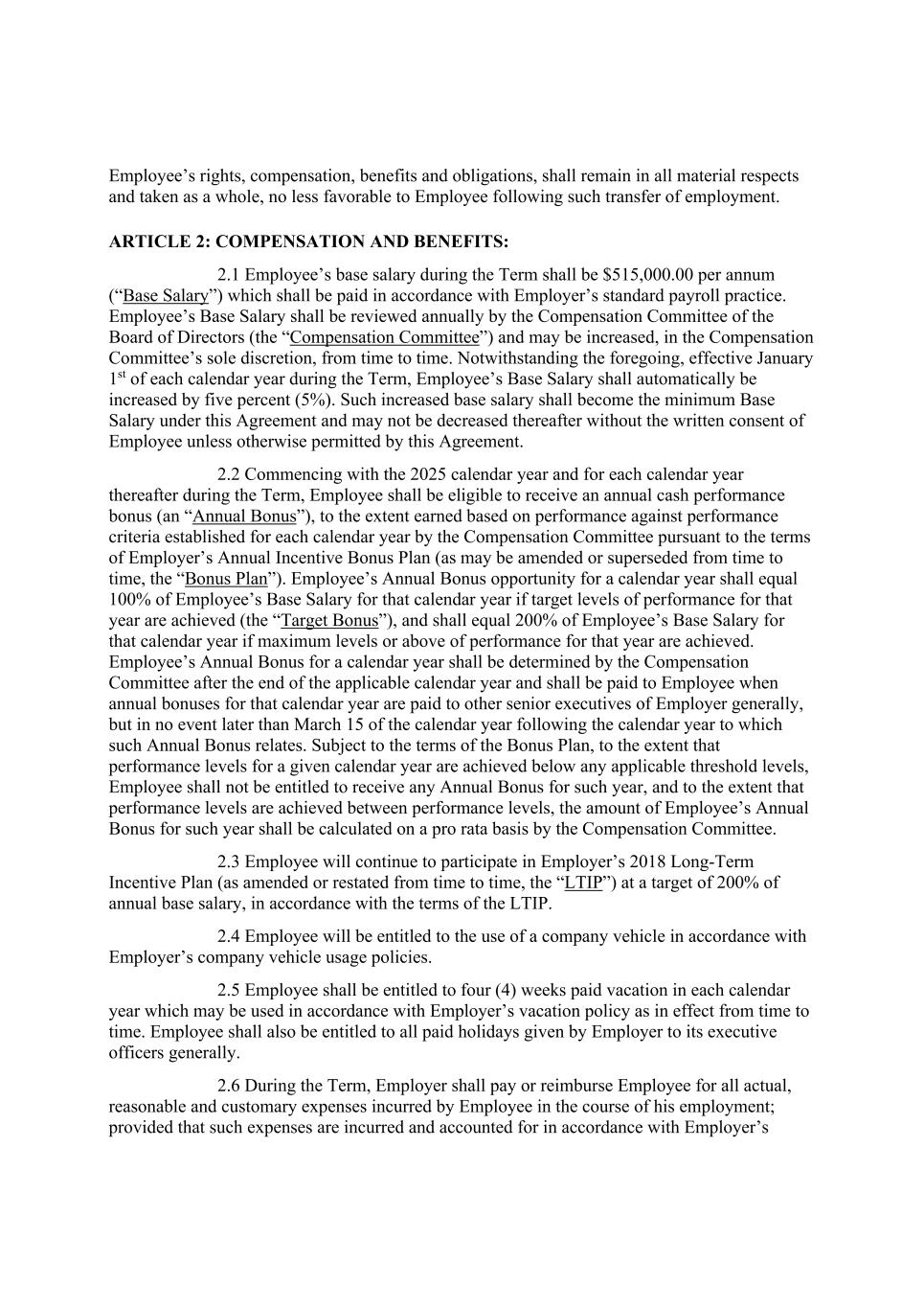 Employee’s rights, compensation, benefits and obligations, shall remain in all material respects and taken as a whole, no less favorable to Employee following such transfer of employment. ARTICLE 2: COMPENSATION AND BENEFITS: 2.1 Employee’s base salary during the Term shall be $515,000.00 per annum (“Base Salary”) which shall be paid in accordance with Employer’s standard payroll practice. Employee’s Base Salary shall be reviewed annually by the Compensation Committee of the Board of Directors (the “Compensation Committee”) and may be increased, in the Compensation Committee’s sole discretion, from time to time. Notwithstanding the foregoing, effective January 1st of each calendar year during the Term, Employee’s Base Salary shall automatically be increased by five percent (5%). Such increased base salary shall become the minimum Base Salary under this Agreement and may not be decreased thereafter without the written consent of Employee unless otherwise permitted by this Agreement. 2.2 Commencing with the 2025 calendar year and for each calendar year thereafter during the Term, Employee shall be eligible to receive an annual cash performance bonus (an “Annual Bonus”), to the extent earned based on performance against performance criteria established for each calendar year by the Compensation Committee pursuant to the terms of Employer’s Annual Incentive Bonus Plan (as may be amended or superseded from time to time, the “Bonus Plan”). Employee’s Annual Bonus opportunity for a calendar year shall equal 100% of Employee’s Base Salary for that calendar year if target levels of performance for that year are achieved (the “Target Bonus”), and shall equal 200% of Employee’s Base Salary for that calendar year if maximum levels or above of performance for that year are achieved. Employee’s Annual Bonus for a calendar year shall be determined by the Compensation Committee after the end of the applicable calendar year and shall be paid to Employee when annual bonuses for that calendar year are paid to other senior executives of Employer generally, but in no event later than March 15 of the calendar year following the calendar year to which such Annual Bonus relates. Subject to the terms of the Bonus Plan, to the extent that performance levels for a given calendar year are achieved below any applicable threshold levels, Employee shall not be entitled to receive any Annual Bonus for such year, and to the extent that performance levels are achieved between performance levels, the amount of Employee’s Annual Bonus for such year shall be calculated on a pro rata basis by the Compensation Committee. 2.3 Employee will continue to participate in Employer’s 2018 Long-Term Incentive Plan (as amended or restated from time to time, the “LTIP”) at a target of 200% of annual base salary, in accordance with the terms of the LTIP. 2.4 Employee will be entitled to the use of a company vehicle in accordance with Employer’s company vehicle usage policies. 2.5 Employee shall be entitled to four (4) weeks paid vacation in each calendar year which may be used in accordance with Employer’s vacation policy as in effect from time to time. Employee shall also be entitled to all paid holidays given by Employer to its executive officers generally. 2.6 During the Term, Employer shall pay or reimburse Employee for all actual, reasonable and customary expenses incurred by Employee in the course of his employment; provided that such expenses are incurred and accounted for in accordance with Employer’s