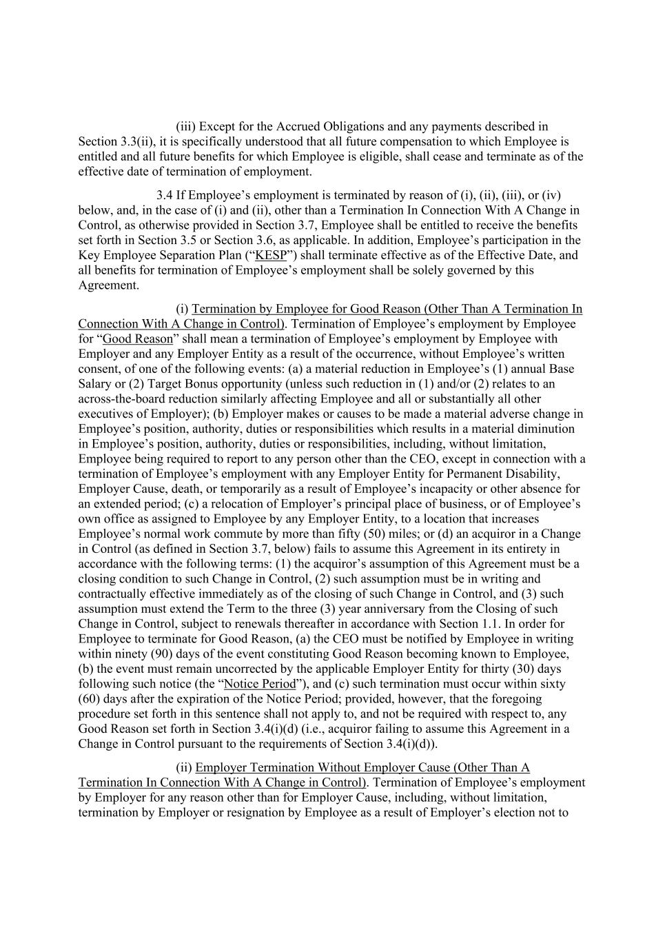(iii) Except for the Accrued Obligations and any payments described in Section 3.3(ii), it is specifically understood that all future compensation to which Employee is entitled and all future benefits for which Employee is eligible, shall cease and terminate as of the effective date of termination of employment. 3.4 If Employee’s employment is terminated by reason of (i), (ii), (iii), or (iv) below, and, in the case of (i) and (ii), other than a Termination In Connection With A Change in Control, as otherwise provided in Section 3.7, Employee shall be entitled to receive the benefits set forth in Section 3.5 or Section 3.6, as applicable. In addition, Employee’s participation in the Key Employee Separation Plan (“KESP”) shall terminate effective as of the Effective Date, and all benefits for termination of Employee’s employment shall be solely governed by this Agreement. (i) Termination by Employee for Good Reason (Other Than A Termination In Connection With A Change in Control). Termination of Employee’s employment by Employee for “Good Reason” shall mean a termination of Employee’s employment by Employee with Employer and any Employer Entity as a result of the occurrence, without Employee’s written consent, of one of the following events: (a) a material reduction in Employee’s (1) annual Base Salary or (2) Target Bonus opportunity (unless such reduction in (1) and/or (2) relates to an across-the-board reduction similarly affecting Employee and all or substantially all other executives of Employer); (b) Employer makes or causes to be made a material adverse change in Employee’s position, authority, duties or responsibilities which results in a material diminution in Employee’s position, authority, duties or responsibilities, including, without limitation, Employee being required to report to any person other than the CEO, except in connection with a termination of Employee’s employment with any Employer Entity for Permanent Disability, Employer Cause, death, or temporarily as a result of Employee’s incapacity or other absence for an extended period; (c) a relocation of Employer’s principal place of business, or of Employee’s own office as assigned to Employee by any Employer Entity, to a location that increases Employee’s normal work commute by more than fifty (50) miles; or (d) an acquiror in a Change in Control (as defined in Section 3.7, below) fails to assume this Agreement in its entirety in accordance with the following terms: (1) the acquiror’s assumption of this Agreement must be a closing condition to such Change in Control, (2) such assumption must be in writing and contractually effective immediately as of the closing of such Change in Control, and (3) such assumption must extend the Term to the three (3) year anniversary from the Closing of such Change in Control, subject to renewals thereafter in accordance with Section 1.1. In order for Employee to terminate for Good Reason, (a) the CEO must be notified by Employee in writing within ninety (90) days of the event constituting Good Reason becoming known to Employee, (b) the event must remain uncorrected by the applicable Employer Entity for thirty (30) days following such notice (the “Notice Period”), and (c) such termination must occur within sixty (60) days after the expiration of the Notice Period; provided, however, that the foregoing procedure set forth in this sentence shall not apply to, and not be required with respect to, any Good Reason set forth in Section 3.4(i)(d) (i.e., acquiror failing to assume this Agreement in a Change in Control pursuant to the requirements of Section 3.4(i)(d)). (ii) Employer Termination Without Employer Cause (Other Than A Termination In Connection With A Change in Control). Termination of Employee’s employment by Employer for any reason other than for Employer Cause, including, without limitation, termination by Employer or resignation by Employee as a result of Employer’s election not to