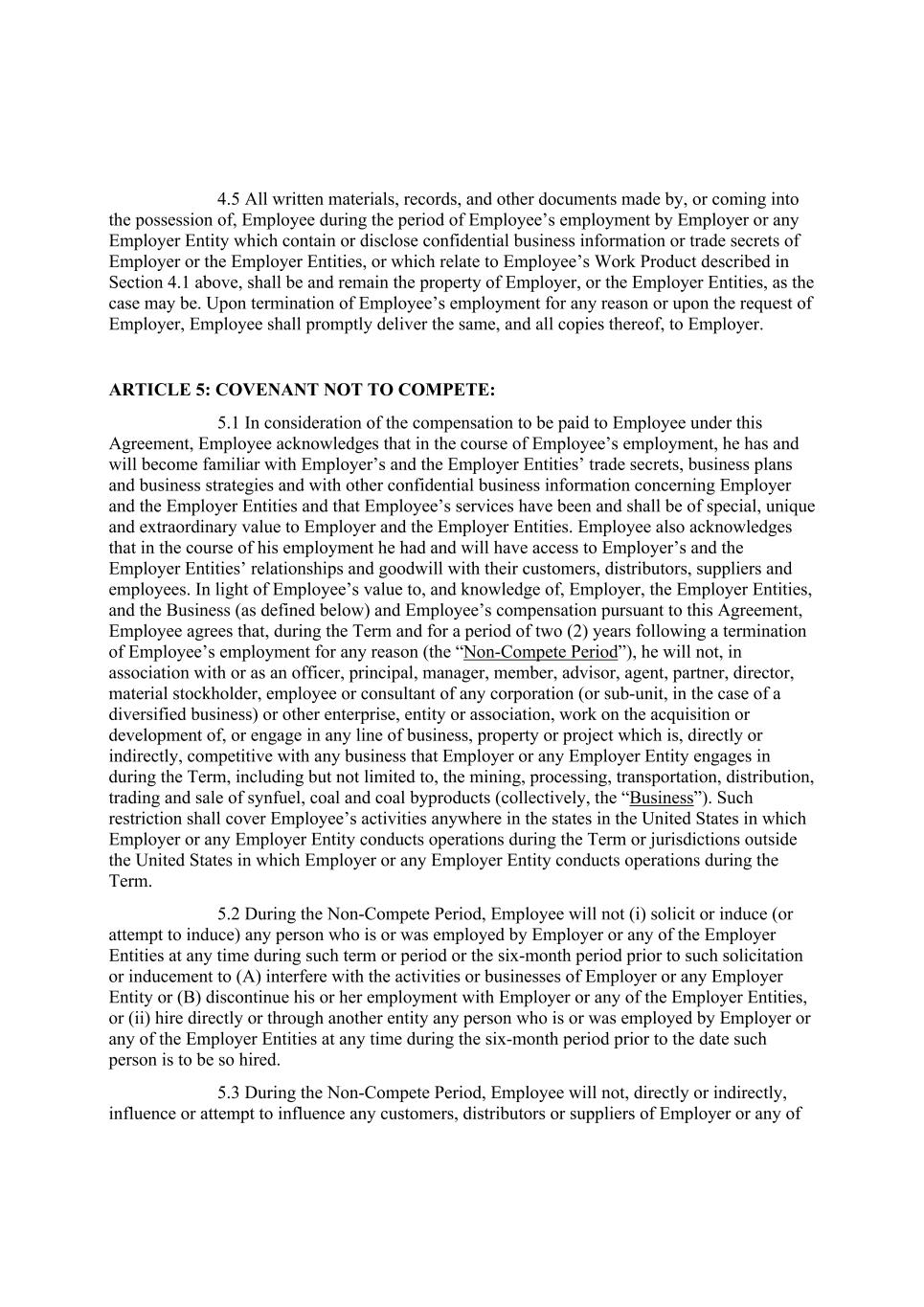 4.5 All written materials, records, and other documents made by, or coming into the possession of, Employee during the period of Employee’s employment by Employer or any Employer Entity which contain or disclose confidential business information or trade secrets of Employer or the Employer Entities, or which relate to Employee’s Work Product described in Section 4.1 above, shall be and remain the property of Employer, or the Employer Entities, as the case may be. Upon termination of Employee’s employment for any reason or upon the request of Employer, Employee shall promptly deliver the same, and all copies thereof, to Employer. ARTICLE 5: COVENANT NOT TO COMPETE: 5.1 In consideration of the compensation to be paid to Employee under this Agreement, Employee acknowledges that in the course of Employee’s employment, he has and will become familiar with Employer’s and the Employer Entities’ trade secrets, business plans and business strategies and with other confidential business information concerning Employer and the Employer Entities and that Employee’s services have been and shall be of special, unique and extraordinary value to Employer and the Employer Entities. Employee also acknowledges that in the course of his employment he had and will have access to Employer’s and the Employer Entities’ relationships and goodwill with their customers, distributors, suppliers and employees. In light of Employee’s value to, and knowledge of, Employer, the Employer Entities, and the Business (as defined below) and Employee’s compensation pursuant to this Agreement, Employee agrees that, during the Term and for a period of two (2) years following a termination of Employee’s employment for any reason (the “Non-Compete Period”), he will not, in association with or as an officer, principal, manager, member, advisor, agent, partner, director, material stockholder, employee or consultant of any corporation (or sub-unit, in the case of a diversified business) or other enterprise, entity or association, work on the acquisition or development of, or engage in any line of business, property or project which is, directly or indirectly, competitive with any business that Employer or any Employer Entity engages in during the Term, including but not limited to, the mining, processing, transportation, distribution, trading and sale of synfuel, coal and coal byproducts (collectively, the “Business”). Such restriction shall cover Employee’s activities anywhere in the states in the United States in which Employer or any Employer Entity conducts operations during the Term or jurisdictions outside the United States in which Employer or any Employer Entity conducts operations during the Term. 5.2 During the Non-Compete Period, Employee will not (i) solicit or induce (or attempt to induce) any person who is or was employed by Employer or any of the Employer Entities at any time during such term or period or the six-month period prior to such solicitation or inducement to (A) interfere with the activities or businesses of Employer or any Employer Entity or (B) discontinue his or her employment with Employer or any of the Employer Entities, or (ii) hire directly or through another entity any person who is or was employed by Employer or any of the Employer Entities at any time during the six-month period prior to the date such person is to be so hired. 5.3 During the Non-Compete Period, Employee will not, directly or indirectly, influence or attempt to influence any customers, distributors or suppliers of Employer or any of