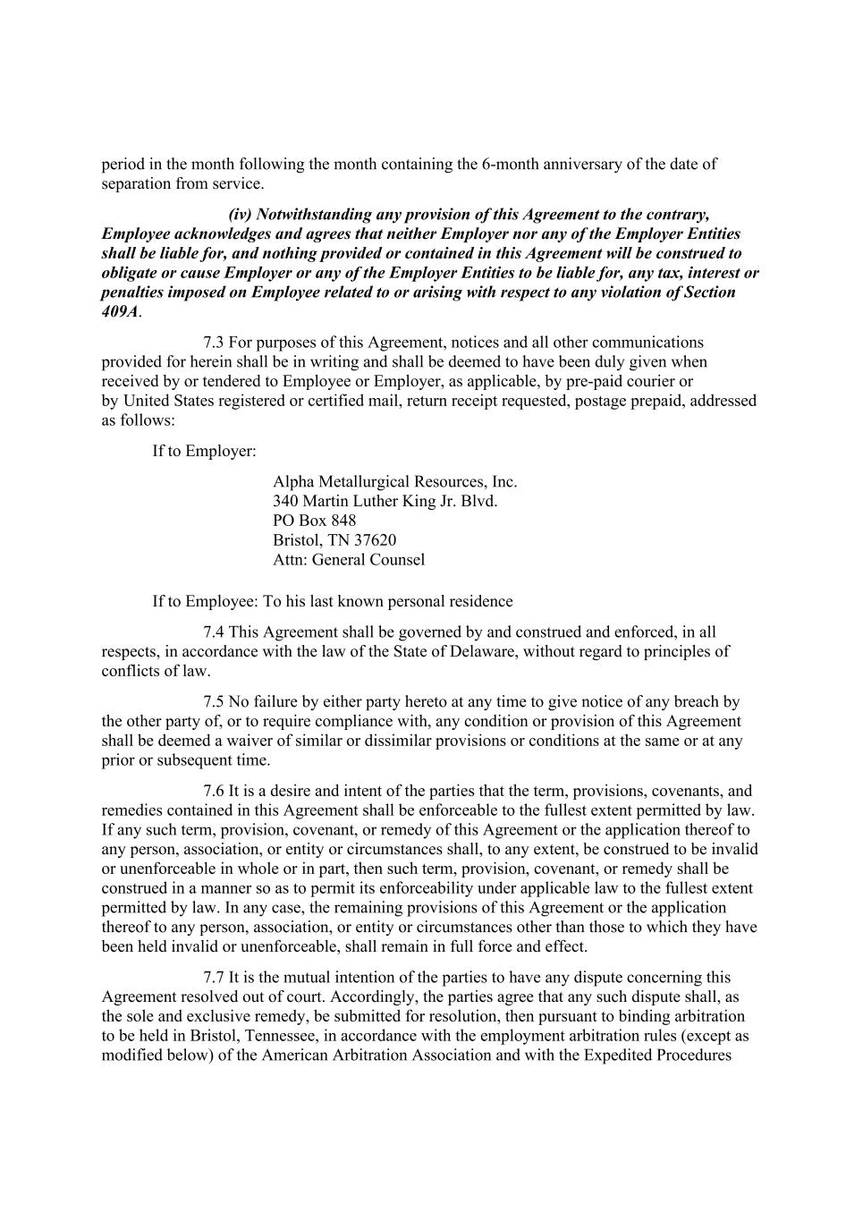period in the month following the month containing the 6-month anniversary of the date of separation from service. (iv) Notwithstanding any provision of this Agreement to the contrary, Employee acknowledges and agrees that neither Employer nor any of the Employer Entities shall be liable for, and nothing provided or contained in this Agreement will be construed to obligate or cause Employer or any of the Employer Entities to be liable for, any tax, interest or penalties imposed on Employee related to or arising with respect to any violation of Section 409A. 7.3 For purposes of this Agreement, notices and all other communications provided for herein shall be in writing and shall be deemed to have been duly given when received by or tendered to Employee or Employer, as applicable, by pre-paid courier or by United States registered or certified mail, return receipt requested, postage prepaid, addressed as follows: If to Employer: Alpha Metallurgical Resources, Inc. 340 Martin Luther King Jr. Blvd. PO Box 848 Bristol, TN 37620 Attn: General Counsel If to Employee: To his last known personal residence 7.4 This Agreement shall be governed by and construed and enforced, in all respects, in accordance with the law of the State of Delaware, without regard to principles of conflicts of law. 7.5 No failure by either party hereto at any time to give notice of any breach by the other party of, or to require compliance with, any condition or provision of this Agreement shall be deemed a waiver of similar or dissimilar provisions or conditions at the same or at any prior or subsequent time. 7.6 It is a desire and intent of the parties that the term, provisions, covenants, and remedies contained in this Agreement shall be enforceable to the fullest extent permitted by law. If any such term, provision, covenant, or remedy of this Agreement or the application thereof to any person, association, or entity or circumstances shall, to any extent, be construed to be invalid or unenforceable in whole or in part, then such term, provision, covenant, or remedy shall be construed in a manner so as to permit its enforceability under applicable law to the fullest extent permitted by law. In any case, the remaining provisions of this Agreement or the application thereof to any person, association, or entity or circumstances other than those to which they have been held invalid or unenforceable, shall remain in full force and effect. 7.7 It is the mutual intention of the parties to have any dispute concerning this Agreement resolved out of court. Accordingly, the parties agree that any such dispute shall, as the sole and exclusive remedy, be submitted for resolution, then pursuant to binding arbitration to be held in Bristol, Tennessee, in accordance with the employment arbitration rules (except as modified below) of the American Arbitration Association and with the Expedited Procedures