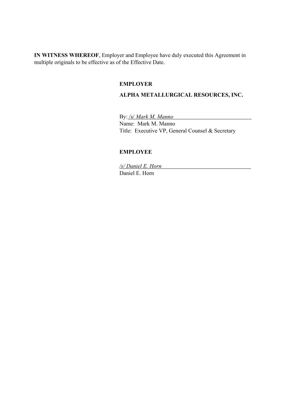 IN WITNESS WHEREOF, Employer and Employee have duly executed this Agreement in multiple originals to be effective as of the Effective Date. EMPLOYER ALPHA METALLURGICAL RESOURCES, INC. By: /s/ Mark M. Manno | Name: Mark M. Manno Title: Executive VP, General Counsel & Secretary EMPLOYEE /s/ Daniel E. Horn | Daniel E. Horn