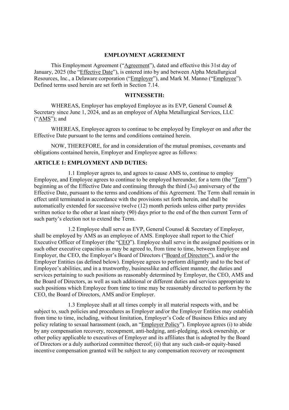 EMPLOYMENT AGREEMENT This Employment Agreement (“Agreement”), dated and effective this 31st day of January, 2025 (the “Effective Date”), is entered into by and between Alpha Metallurgical Resources, Inc., a Delaware corporation (“Employer”), and Mark M. Manno (“Employee”). Defined terms used herein are set forth in Section 7.14. WITNESSETH: WHEREAS, Employer has employed Employee as its EVP, General Counsel & Secretary since June 1, 2024, and as an employee of Alpha Metallurgical Services, LLC (“AMS”); and WHEREAS, Employee agrees to continue to be employed by Employer on and after the Effective Date pursuant to the terms and conditions contained herein. NOW, THEREFORE, for and in consideration of the mutual promises, covenants and obligations contained herein, Employer and Employee agree as follows: ARTICLE 1: EMPLOYMENT AND DUTIES: 1.1 Employer agrees to, and agrees to cause AMS to, continue to employ Employee, and Employee agrees to continue to be employed hereunder, for a term (the “Term”) beginning as of the Effective Date and continuing through the third (3rd) anniversary of the Effective Date, pursuant to the terms and conditions of this Agreement. The Term shall remain in effect until terminated in accordance with the provisions set forth herein, and shall be automatically extended for successive twelve (12) month periods unless either party provides written notice to the other at least ninety (90) days prior to the end of the then current Term of such party’s election not to extend the Term. 1.2 Employee shall serve as EVP, General Counsel & Secretary of Employer, shall be employed by AMS as an employee of AMS. Employee shall report to the Chief Executive Officer of Employer (the “CEO”). Employee shall serve in the assigned positions or in such other executive capacities as may be agreed to, from time to time, between Employee and Employer, the CEO, the Employer’s Board of Directors (“Board of Directors”), and/or the Employer Entities (as defined below). Employee agrees to perform diligently and to the best of Employee’s abilities, and in a trustworthy, businesslike and efficient manner, the duties and services pertaining to such positions as reasonably determined by Employer, the CEO, AMS and the Board of Directors, as well as such additional or different duties and services appropriate to such positions which Employee from time to time may be reasonably directed to perform by the CEO, the Board of Directors, AMS and/or Employer. 1.3 Employee shall at all times comply in all material respects with, and be subject to, such policies and procedures as Employer and/or the Employer Entities may establish from time to time, including, without limitation, Employer’s Code of Business Ethics and any policy relating to sexual harassment (each, an “Employer Policy”). Employee agrees (i) to abide by any compensation recovery, recoupment, anti-hedging, anti-pledging, stock ownership, or other policy applicable to executives of Employer and its affiliates that is adopted by the Board of Directors or a duly authorized committee thereof; (ii) that any such cash-or equity-based incentive compensation granted will be subject to any compensation recovery or recoupment