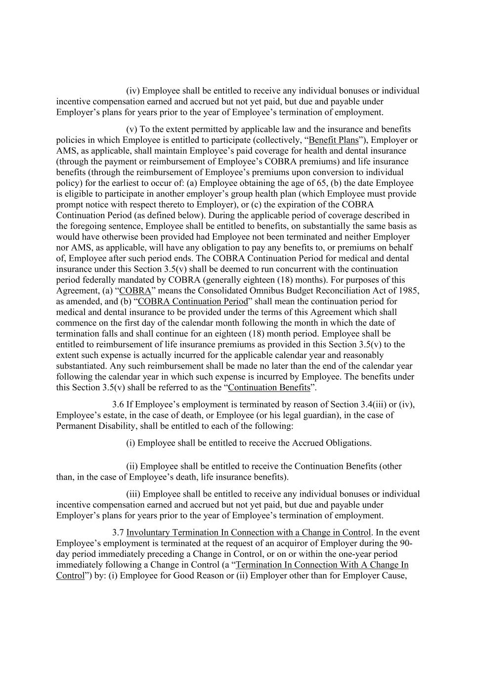 (iv) Employee shall be entitled to receive any individual bonuses or individual incentive compensation earned and accrued but not yet paid, but due and payable under Employer’s plans for years prior to the year of Employee’s termination of employment. (v) To the extent permitted by applicable law and the insurance and benefits policies in which Employee is entitled to participate (collectively, “Benefit Plans”), Employer or AMS, as applicable, shall maintain Employee’s paid coverage for health and dental insurance (through the payment or reimbursement of Employee’s COBRA premiums) and life insurance benefits (through the reimbursement of Employee’s premiums upon conversion to individual policy) for the earliest to occur of: (a) Employee obtaining the age of 65, (b) the date Employee is eligible to participate in another employer’s group health plan (which Employee must provide prompt notice with respect thereto to Employer), or (c) the expiration of the COBRA Continuation Period (as defined below). During the applicable period of coverage described in the foregoing sentence, Employee shall be entitled to benefits, on substantially the same basis as would have otherwise been provided had Employee not been terminated and neither Employer nor AMS, as applicable, will have any obligation to pay any benefits to, or premiums on behalf of, Employee after such period ends. The COBRA Continuation Period for medical and dental insurance under this Section 3.5(v) shall be deemed to run concurrent with the continuation period federally mandated by COBRA (generally eighteen (18) months). For purposes of this Agreement, (a) “COBRA” means the Consolidated Omnibus Budget Reconciliation Act of 1985, as amended, and (b) “COBRA Continuation Period” shall mean the continuation period for medical and dental insurance to be provided under the terms of this Agreement which shall commence on the first day of the calendar month following the month in which the date of termination falls and shall continue for an eighteen (18) month period. Employee shall be entitled to reimbursement of life insurance premiums as provided in this Section 3.5(v) to the extent such expense is actually incurred for the applicable calendar year and reasonably substantiated. Any such reimbursement shall be made no later than the end of the calendar year following the calendar year in which such expense is incurred by Employee. The benefits under this Section 3.5(v) shall be referred to as the “Continuation Benefits”. 3.6 If Employee’s employment is terminated by reason of Section 3.4(iii) or (iv), Employee’s estate, in the case of death, or Employee (or his legal guardian), in the case of Permanent Disability, shall be entitled to each of the following: (i) Employee shall be entitled to receive the Accrued Obligations. (ii) Employee shall be entitled to receive the Continuation Benefits (other than, in the case of Employee’s death, life insurance benefits). (iii) Employee shall be entitled to receive any individual bonuses or individual incentive compensation earned and accrued but not yet paid, but due and payable under Employer’s plans for years prior to the year of Employee’s termination of employment. 3.7 Involuntary Termination In Connection with a Change in Control. In the event Employee’s employment is terminated at the request of an acquiror of Employer during the 90- day period immediately preceding a Change in Control, or on or within the one-year period immediately following a Change in Control (a “Termination In Connection With A Change In Control”) by: (i) Employee for Good Reason or (ii) Employer other than for Employer Cause,