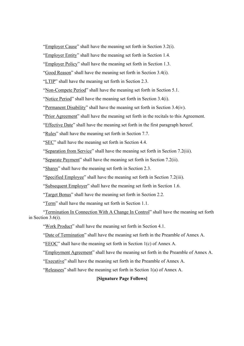 “Employer Cause” shall have the meaning set forth in Section 3.2(i). “Employer Entity” shall have the meaning set forth in Section 1.4. “Employer Policy” shall have the meaning set forth in Section 1.3. “Good Reason” shall have the meaning set forth in Section 3.4(i). “LTIP” shall have the meaning set forth in Section 2.3. “Non-Compete Period” shall have the meaning set forth in Section 5.1. “Notice Period” shall have the meaning set forth in Section 3.4(i). “Permanent Disability” shall have the meaning set forth in Section 3.4(iv). “Prior Agreement” shall have the meaning set forth in the recitals to this Agreement. “Effective Date” shall have the meaning set forth in the first paragraph hereof. “Rules” shall have the meaning set forth in Section 7.7. “SEC” shall have the meaning set forth in Section 4.4. “Separation from Service” shall have the meaning set forth in Section 7.2(iii). “Separate Payment” shall have the meaning set forth in Section 7.2(ii). “Shares” shall have the meaning set forth in Section 2.3. “Specified Employee” shall have the meaning set forth in Section 7.2(iii). “Subsequent Employer” shall have the meaning set forth in Section 1.6. “Target Bonus” shall have the meaning set forth in Section 2.2. “Term” shall have the meaning set forth in Section 1.1. “Termination In Connection With A Change In Control” shall have the meaning set forth in Section 3.6(i). “Work Product” shall have the meaning set forth in Section 4.1. “Date of Termination” shall have the meaning set forth in the Preamble of Annex A. “EEOC” shall have the meaning set forth in Section 1(c) of Annex A. “Employment Agreement” shall have the meaning set forth in the Preamble of Annex A. “Executive” shall have the meaning set forth in the Preamble of Annex A. “Releasees” shall have the meaning set forth in Section 1(a) of Annex A. [Signature Page Follows]