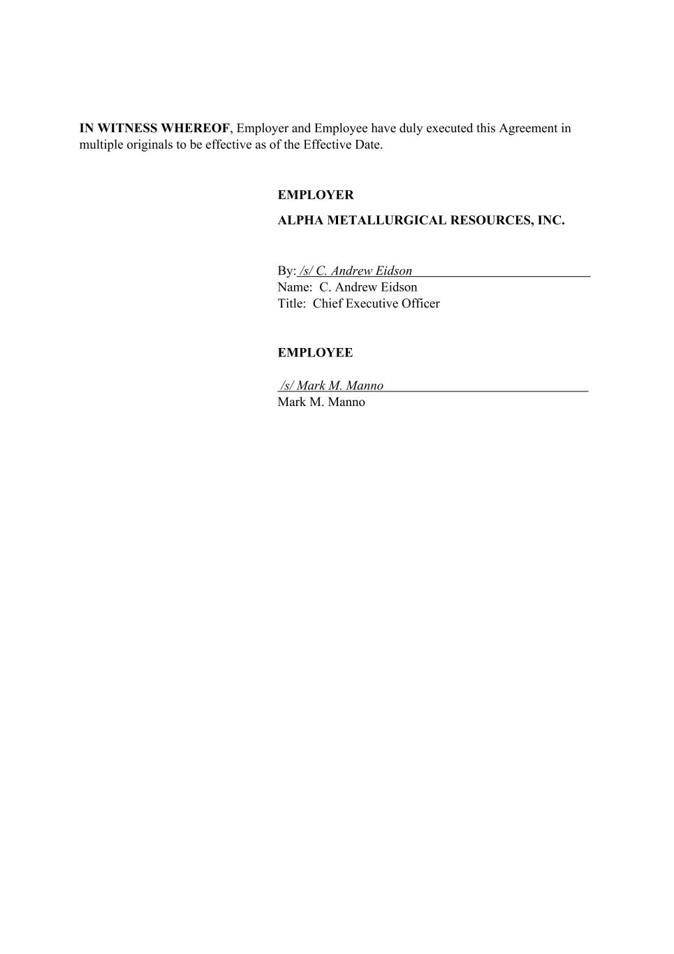 IN WITNESS WHEREOF, Employer and Employee have duly executed this Agreement in multiple originals to be effective as of the Effective Date. EMPLOYER ALPHA METALLURGICAL RESOURCES, INC. By: /s/ C. Andrew Eidson | Name: C. Andrew Eidson Title: Chief Executive Officer EMPLOYEE /s/ Mark M. Manno | Mark M. Manno