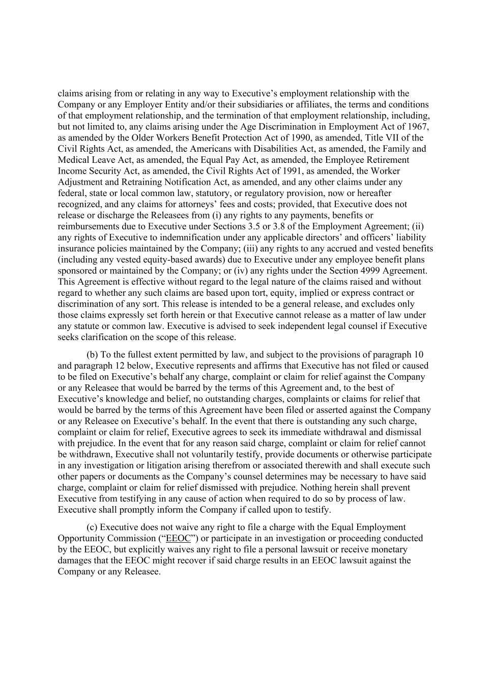 claims arising from or relating in any way to Executive’s employment relationship with the Company or any Employer Entity and/or their subsidiaries or affiliates, the terms and conditions of that employment relationship, and the termination of that employment relationship, including, but not limited to, any claims arising under the Age Discrimination in Employment Act of 1967, as amended by the Older Workers Benefit Protection Act of 1990, as amended, Title VII of the Civil Rights Act, as amended, the Americans with Disabilities Act, as amended, the Family and Medical Leave Act, as amended, the Equal Pay Act, as amended, the Employee Retirement Income Security Act, as amended, the Civil Rights Act of 1991, as amended, the Worker Adjustment and Retraining Notification Act, as amended, and any other claims under any federal, state or local common law, statutory, or regulatory provision, now or hereafter recognized, and any claims for attorneys’ fees and costs; provided, that Executive does not release or discharge the Releasees from (i) any rights to any payments, benefits or reimbursements due to Executive under Sections 3.5 or 3.8 of the Employment Agreement; (ii) any rights of Executive to indemnification under any applicable directors’ and officers’ liability insurance policies maintained by the Company; (iii) any rights to any accrued and vested benefits (including any vested equity-based awards) due to Executive under any employee benefit plans sponsored or maintained by the Company; or (iv) any rights under the Section 4999 Agreement. This Agreement is effective without regard to the legal nature of the claims raised and without regard to whether any such claims are based upon tort, equity, implied or express contract or discrimination of any sort. This release is intended to be a general release, and excludes only those claims expressly set forth herein or that Executive cannot release as a matter of law under any statute or common law. Executive is advised to seek independent legal counsel if Executive seeks clarification on the scope of this release. (b) To the fullest extent permitted by law, and subject to the provisions of paragraph 10 and paragraph 12 below, Executive represents and affirms that Executive has not filed or caused to be filed on Executive’s behalf any charge, complaint or claim for relief against the Company or any Releasee that would be barred by the terms of this Agreement and, to the best of Executive’s knowledge and belief, no outstanding charges, complaints or claims for relief that would be barred by the terms of this Agreement have been filed or asserted against the Company or any Releasee on Executive’s behalf. In the event that there is outstanding any such charge, complaint or claim for relief, Executive agrees to seek its immediate withdrawal and dismissal with prejudice. In the event that for any reason said charge, complaint or claim for relief cannot be withdrawn, Executive shall not voluntarily testify, provide documents or otherwise participate in any investigation or litigation arising therefrom or associated therewith and shall execute such other papers or documents as the Company’s counsel determines may be necessary to have said charge, complaint or claim for relief dismissed with prejudice. Nothing herein shall prevent Executive from testifying in any cause of action when required to do so by process of law. Executive shall promptly inform the Company if called upon to testify. (c) Executive does not waive any right to file a charge with the Equal Employment Opportunity Commission (“EEOC”) or participate in an investigation or proceeding conducted by the EEOC, but explicitly waives any right to file a personal lawsuit or receive monetary damages that the EEOC might recover if said charge results in an EEOC lawsuit against the Company or any Releasee.