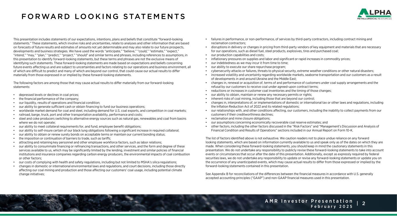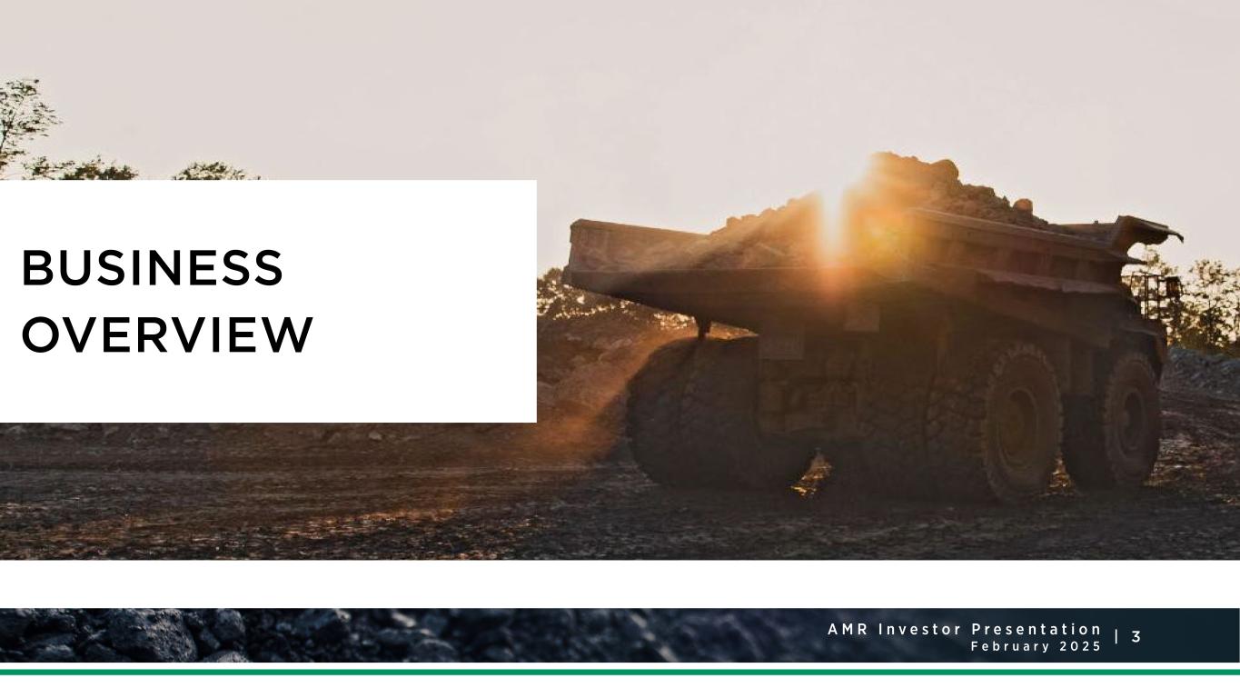 2A M R R a t i n g s A g e n c y P r e s e n t a t i o n J a n u a r y 2 0 2 5 |A M R I n v e s t o r F e b r F O R WA R D LO O K I N G S TAT E M E N T S This presentation includes statements of our expectations, intentions, plans and beliefs that constitute “forward-looking statements.” These statements, which involve risks and uncertainties, relate to analyses and other information that are based on forecasts of future results and estimates of amounts not yet determinable and may also relate to our future prospects, developments and business strategies. We have used the words “anticipate,” “believe,” “could,” “estimate,” “expect,” “intend,” “may,” “plan,” “predict,” “project,” “should” and similar terms and phrases, including references to assumptions, in this presentation to identify forward-looking statements, but these terms and phrases are not the exclusive means of identifying such statements. These forward-looking statements are made based on expectations and beliefs concerning future events affecting us and are subject to uncertainties and factors relating to our operations and business environment, all of which are difficult to predict and many of which are beyond our control, that could cause our actual results to differ materially from those expressed in or implied by these forward-looking statements. The following factors are among those that may cause actual results to differ materially from our forward-looking statements: • depressed levels or declines in coal prices; • the financial performance of the company; • our liquidity, results of operations and financial condition; • our ability to generate sufficient cash or obtain financing to fund our business operations; • worldwide market demand for coal and steel, including demand for U.S. coal exports, and competition in coal markets; • railroad, barge, truck, port and other transportation availability, performance and costs; • steel and coke producers switching to alternative energy sources such as natural gas, renewables and coal from basins where we do not operate; • our ability to meet collateral requirements for, and fund, employee benefit obligations; • our ability to self-insure certain of our black lung obligations following a significant increase in required collateral; • our ability to obtain or renew surety bonds on acceptable terms or maintain our current bonding status; • the imposition or continuation of barriers to trade, such as tariffs; • attracting and retaining key personnel and other employee workforce factors, such as labor relations; • our ability to consummate financing or refinancing transactions, and other services, and the form and degree of these services available to us, which may be significantly limited by the lending, investment and similar policies of financial institutions and insurance companies regarding carbon energy producers, the environmental impacts of coal combustion or other factors; • our costs of complying with health and safety regulations, including but not limited to MSHA’s silica regulations; • changes in domestic or international environmental laws and regulations, and court decisions, including those directly affecting our coal mining and production and those affecting our customers’ coal usage, including potential climate change initiatives; • failures in performance, or non-performance, of services by third-party contractors, including contract mining and reclamation contractors; • disruptions in delivery or changes in pricing from third-party vendors of key equipment and materials that are necessary for our operations, such as diesel fuel, steel products, explosives, tires and purchased coal; • our production capabilities and costs; • inflationary pressures on supplies and labor and significant or rapid increases in commodity prices; • our indebtedness as we may incur it from time to time; • our ability to execute our share repurchase program; • cybersecurity attacks or failures, threats to physical security, extreme weather conditions or other natural disasters; • increased volatility and uncertainty regarding worldwide markets, seaborne transportation and our customers as a result of developments in and around Ukraine and the Middle East; • changes in, renewal or acquisition of, terms of and performance of customers under coal supply arrangements and the refusal by our customers to receive coal under agreed-upon contract terms; • reductions or increases in customer coal inventories and the timing of those changes; • our ability to obtain, maintain or renew any necessary permits or rights; • inherent risks of coal mining, including those that are beyond our control; • changes in, interpretations of, or implementations of domestic or international tax or other laws and regulations, including the Inflation Reduction Act of 2022 and its related regulations; • our relationships with, and other conditions affecting, our customers, including the inability to collect payments from our customers if their creditworthiness declines; • reclamation and mine closure obligations; • our assumptions concerning economically recoverable coal reserve estimates; and • other factors, including the other factors discussed in the “Risk Factors” and “Management’s Discussion and Analysis of Financial Condition and Results of Operations” sections included in our Annual Report on Form 10-K. The list of factors identified above is not exhaustive. We caution readers not to place undue reliance on any forward looking statements, which are based on information currently available to us and speak only as of the dates on which they are made. When considering these forward-looking statements, you should keep in mind the cautionary statements in this presentation. We do not undertake any responsibility to publicly revise these forward-looking statements to take into account events 