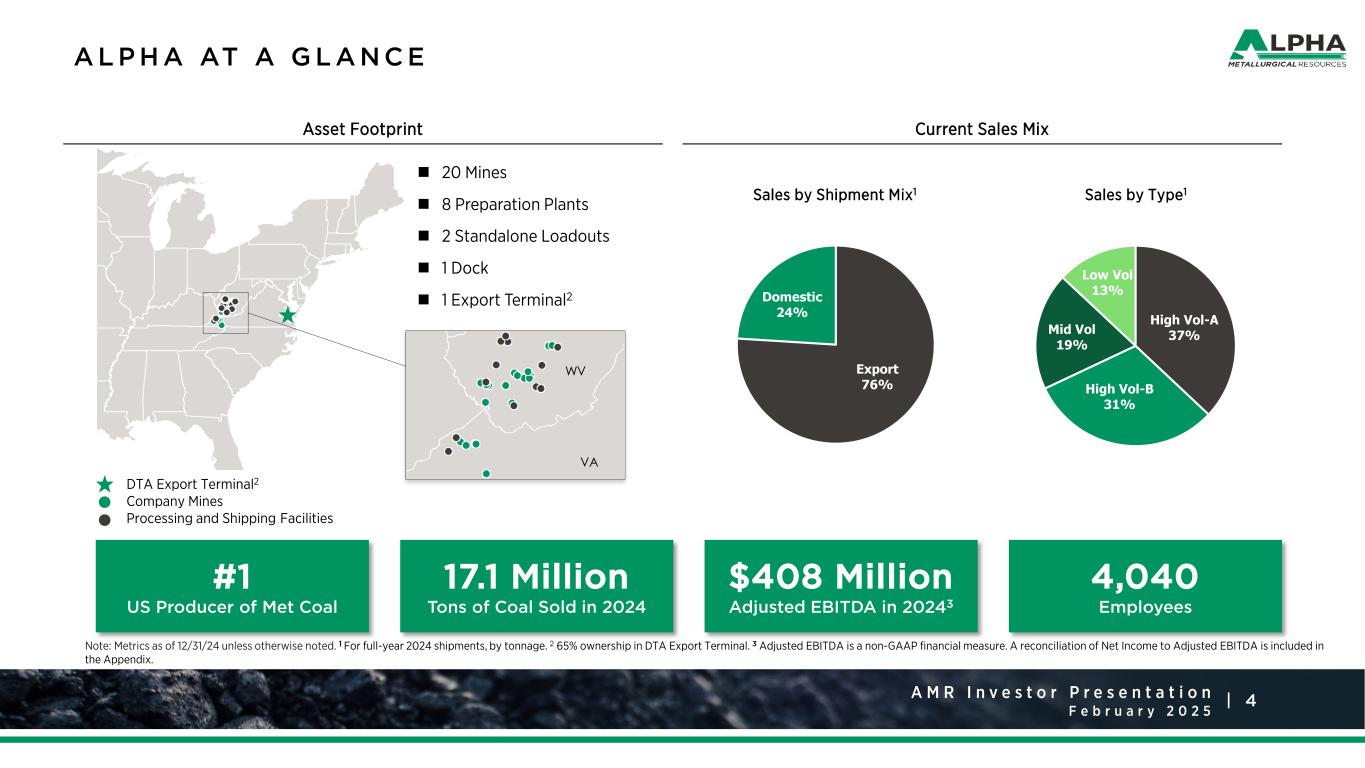 1 1A M R R a t i n g s A g e n c y P r e s e n t a t i o n J a n u a r y 2 0 2 5 |A M R I n v e s t o r F e b r S T R AT E G I C A L LY LO C AT E D AS S E T S W I T H A B I L I T Y TO S E RV E B OT H D O M E S T I C A N D E X P O R T M A R K E T S 3 Note: Metrics as of year-end 2024. 1 Represents Non-GAAP coal sales realization per ton. Refer to Appendix for a reconciliation of this non-GAAP financial measure. 22 % Domestic Coal Revenue 78 % Export Coal Revenue $ 152 Domestic Average Realized Price ($/ton) 1 $ 140 Export Average Realized Price ($/ton) 1 Dominion Terminal Associates (DTA) Coal Export Terminal Export Domestic # 1 US Producer of Met Coal 26 Countries Served 3.9 Million Tons Sold Domestically 13.2 Million Tons Sold Internationally Alpha owns 65% interest in DTA coal export terminal, enhancing access to key export markets and diversifying its customer base  Newport News, Virginia  Hub for Alpha coal exports  Provides: — Transportation flexibility — Coal blending — Storage capacity  Allows control of key export markets and maintains competitive cost