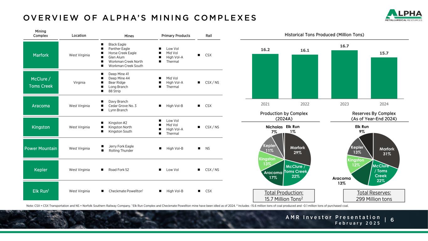 6A M R R a t i n g s A g e n c y P r e s e n t a t i o n J a n u a r y 2 0 2 5 |A M R I n v e s t o r F e b r OV E RV I E W O F A L P H A’ S M I N I N G CO M P L E X E S Mining Complex Location Rail Marfork West Virginia  Black Eagle  Panther Eagle  Horse Creek Eagle  Glen Alum  Workman Creek North  Workman Creek South  Low Vol  Mid Vol  High Vol-A  Thermal  CSX McClure / Toms Creek Virginia  Deep Mine 41  Deep Mine 44  Bear Ridge  Long Branch  88 Strip  Mid Vol  High Vol-A  Thermal  CSX / NS Aracoma West Virginia  Davy Branch  Cedar Grove No. 3  Lynn Branch  High Vol-B  CSX Kingston West Virginia  Kingston #2  Kingston North  Kingston South  Low Vol  Mid Vol  High Vol-A  Thermal  CSX / NS Power Mountain West Virginia  Jerry Fork Eagle  Rolling Thunder  High Vol-B  NS Kepler West Virginia  Road Fork 52  Low Vol  CSX / NS Elk Run1 West Virginia  Checkmate Powellton1  High Vol-B  CSX Primary ProductsMines Note: CSX = CSX Transportation and NS = Norfolk Southern Railway Company. 1 Elk Run Complex and Checkmate Powellton mine have been idled as of 2024. 2 Includes ~15.6 million tons of coal produced and ~0.1 million tons of purchased coal. Historical Tons Produced (Million Tons) Reserves By Complex (As of Year-End 2024) Production by Complex (2024A) Total Reserves: 299 Million tons Total Production: 15.7 Million Tons2 Marfork 31% McClure / Toms Creek 22%Aracoma 13% Kingston 12% Power Mountain 0% Kepler 13% Elk Run 9% 16.2 16.1 16.7 15.7 2021 2022 2023 2024 Marfork 29% McClure / Toms Creek 22% Aracoma 17% Kingston 13% Kepler 11% Nicholas 7% Elk Run 1%