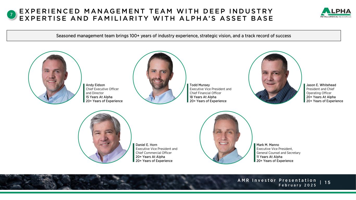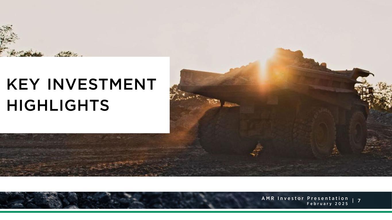 1 4A M R R a t i n g s A g e n c y P r e s e n t a t i o n J a n u a r y 2 0 2 5 |A M R I n v e s t o r F e b r S T R O N G C U LT U R E O F C O M M I T M E N T T O S A F E T Y, E N V I R O N M E N TA L S T E WA R D S H I P, A N D C O N T I N U O U S I M P R O V E M E N T6 Environmental • Environmental Management Systems • Water Management Systems • Waste Management Systems • Biodiversity Control • “Beyond Compliance” Attitude Social • Safety and Health • Workforce and Operations • Community Involvement • Code of Ethics and Responsibility Governance • Rigorous reporting and documentation standards • Strategic shift away from thermal coal Environmental Awards & Recognition  2024 Best Reclaimed Underground Mine  2023 Exemplary Reclamation of Surface Mining  2023 Exemplary Reclamation of Underground Mining  2023 Best AML Dangerous Highwall Elimination  2022 Underground Reclamation Award  2022 Drainage Control award Outstanding Employee Relations Experienced Leadership Driving Growth  Safety performance is ~40% better than industry average1  Competitive compensation and benefits package  Equal opportunity employer  Strict anti-harassment and anti-discrimination policies  85% workforce retention in 2024  Combined 100+ years of experience across the coal and financial industries  83% Board independence  33% Board gender diversity  Average director age of 58 years  Average board tenure of 3 years Note: 1 Represents 2022 – 2024YTD average Non-Fatal Days Lost for Alpha of 1.23 vs. 2.22 for the coal industry average.