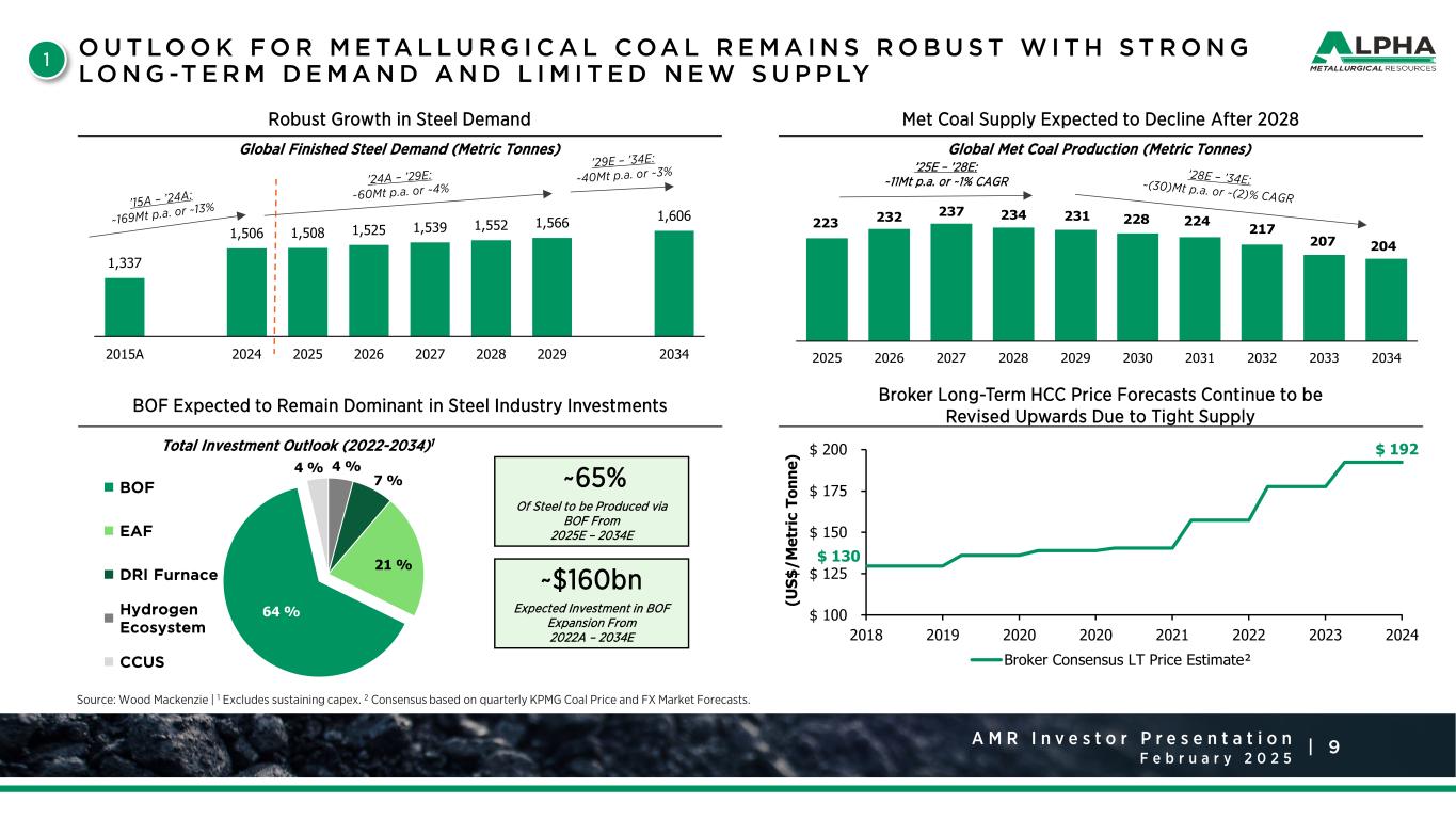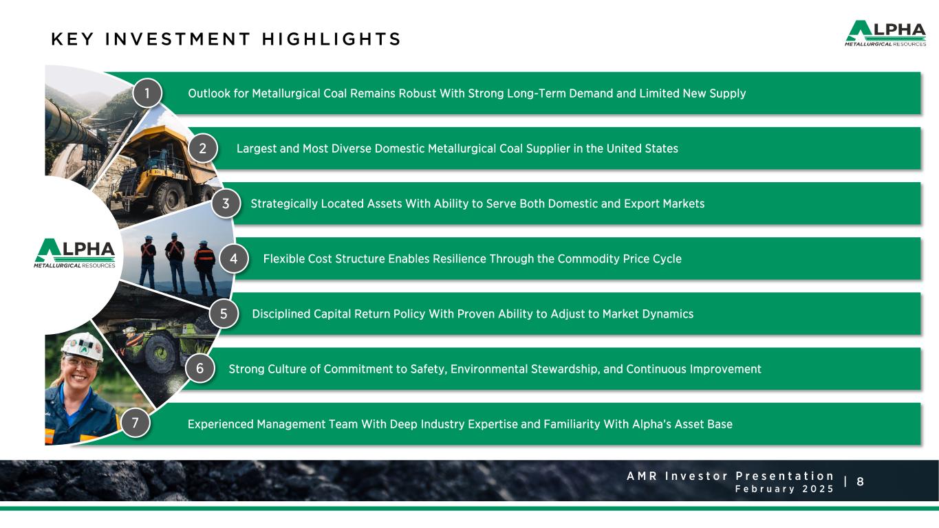 8A M R R a t i n g s A g e n c y P r e s e n t a t i o n J a n u a r y 2 0 2 5 |A M R I n v e s t o r F e b r K E Y I N V E S T M E N T H I G H L I G H T S Strategically Located Assets With Ability to Serve Both Domestic and Export Markets Experienced Management Team With Deep Industry Expertise and Familiarity With Alpha’s Asset Base Largest and Most Diverse Domestic Metallurgical Coal Supplier in the United States Outlook for Metallurgical Coal Remains Robust With Strong Long-Term Demand and Limited New Supply Flexible Cost Structure Enables Resilience Through the Commodity Price Cycle Strong Culture of Commitment to Safety, Environmental Stewardship, and Continuous Improvement Disciplined Capital Return Policy With Proven Ability to Adjust to Market Dynamics 4 1 2 3 5 6 7