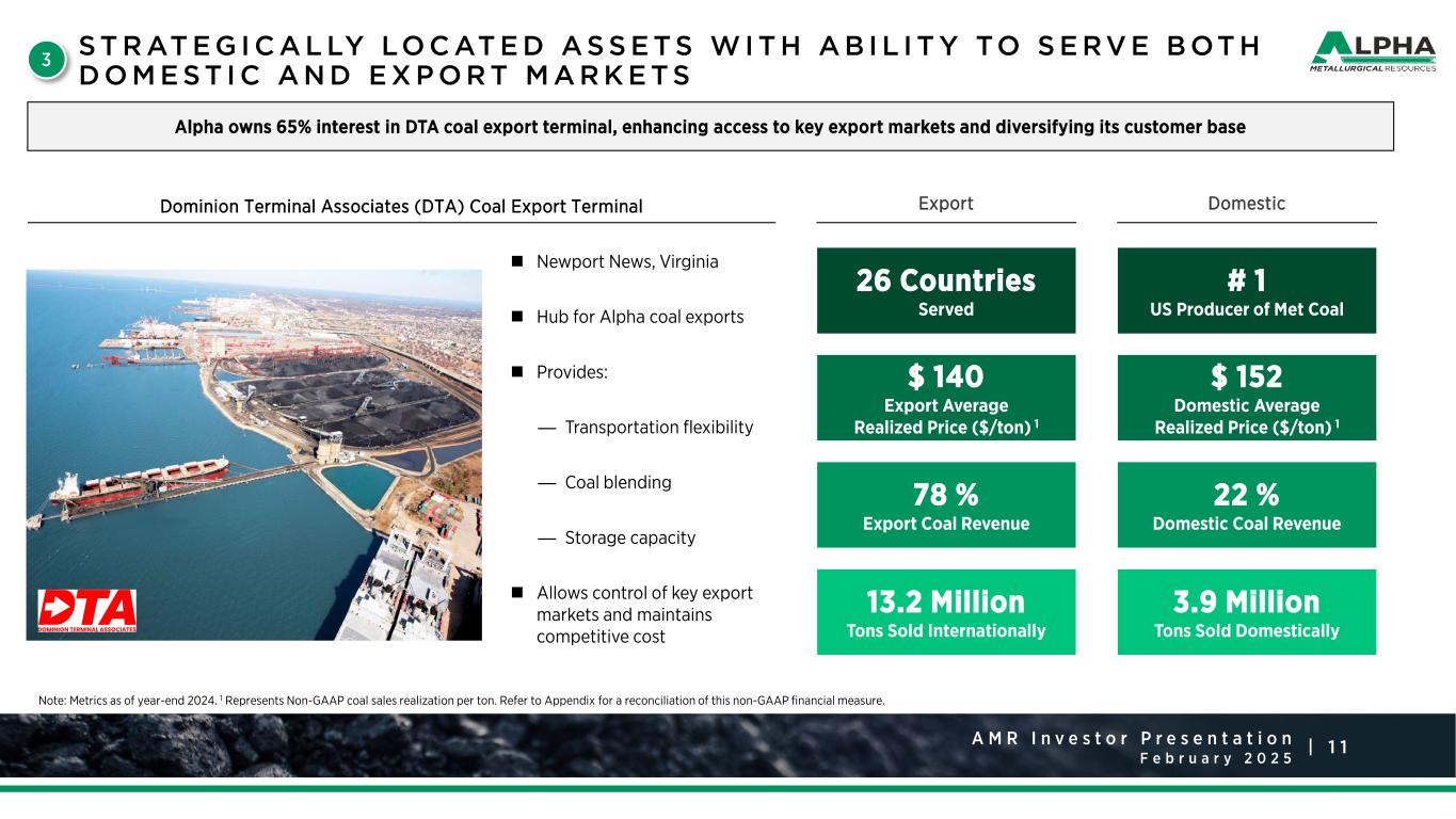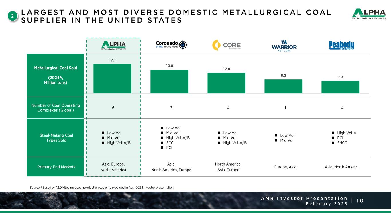 1 0A M R R a t i n g s A g e n c y P r e s e n t a t i o n J a n u a r y 2 0 2 5 |A M R I n v e s t o r F e b r Metallurgical Coal Sold (2024A, Million tons) Number of Coal Operating Complexes (Global) 6 3 4 1 4 Steel-Making Coal Types Sold  Low Vol  Mid Vol  High Vol-A/B  Low Vol  Mid Vol  High Vol-A/B  SCC  PCI  Low Vol  Mid Vol  High Vol-A/B  Low Vol  Mid Vol  High Vol-A  PCI  SHCC Primary End Markets Asia, Europe, North America Asia, North America, Europe North America, Asia, Europe Europe, Asia Asia, North America Source: 1 Based on 12.0 Mtpa met coal production capacity provided in Aug-2024 investor presentation. L A R G E S T A N D M O S T D I V E R S E D O M E S T I C M E TA L LU R G I C A L COA L S U P P L I E R I N T H E U N I T E D S TAT E S 2 1 17.1 13.8 12.0 8.2 7.3