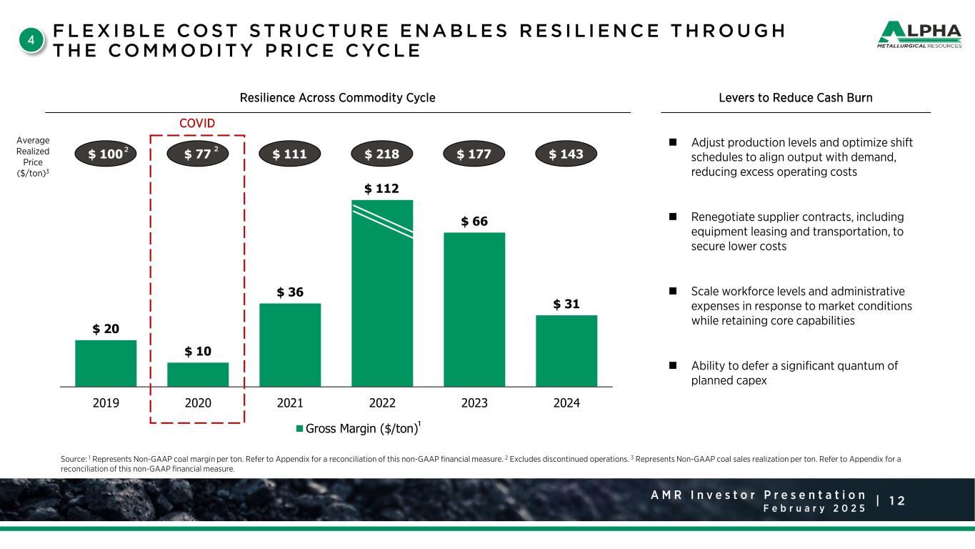 1 2A M R R a t i n g s A g e n c y P r e s e n t a t i o n J a n u a r y 2 0 2 5 |A M R I n v e s t o r F e b r Source: 1 Represents Non-GAAP coal margin per ton. Refer to Appendix for a reconciliation of this non-GAAP financial measure. 2 Excludes discontinued operations. 3 Represents Non-GAAP coal sales realization per ton. Refer to Appendix for a reconciliation of this non-GAAP financial measure. F L E X I B L E CO S T S T R U C T U R E E N A B L E S R E S I L I E N C E T H R O U G H T H E CO M M O D I T Y P R I C E C YC L E 4 Resilience Across Commodity Cycle Levers to Reduce Cash Burn Average Realized Price ($/ton)3 COVID  Adjust production levels and optimize shift schedules to align output with demand, reducing excess operating costs  Renegotiate supplier contracts, including equipment leasing and transportation, to secure lower costs  Scale workforce levels and administrative expenses in response to market conditions while retaining core capabilities  Ability to defer a significant quantum of planned capex 2 1 $ 20 $ 10 $ 36 $ 66 $ 31 2019 2020 2021 2022 2023 2024 Gross Margin ($/ton) $ 100 $ 77 $ 111 $ 218 $ 177 $ 143 $ 112 22