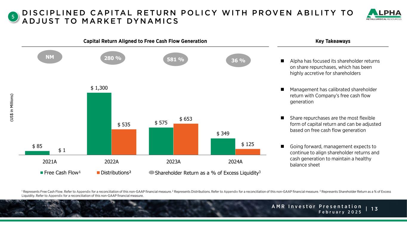 1 3A M R R a t i n g s A g e n c y P r e s e n t a t i o n J a n u a r y 2 0 2 5 |A M R I n v e s t o r F e b r D I S C I P L I N E D C A P I TA L R E T U R N P O L I C Y W I T H P R OV E N A B I L I T Y TO A DJ U S T TO M A R K E T DY N A M I C S 5 1 Represents Free Cash Flow. Refer to Appendix for a reconciliation of this non-GAAP financial measure. 2 Represents Distributions. Refer to Appendix for a reconciliation of this non-GAAP financial measure. 3 Represents Shareholder Return as a % of Excess Liquidity. Refer to Appendix for a reconciliation of this non-GAAP financial measure.  Alpha has focused its shareholder returns on share repurchases, which has been highly accretive for shareholders  Management has calibrated shareholder return with Company’s free cash flow generation  Share repurchases are the most flexible form of capital return and can be adjusted based on free cash flow generation  Going forward, management expects to continue to align shareholder returns and cash generation to maintain a healthy balance sheet Key TakeawaysCapital Return Aligned to Free Cash Flow Generation (U S$ in M ill io ns ) $ 85 $ 1,300 $ 575 $ 349 $ 1 $ 535 $ 653 $ 125 2021A 2022A 2023A 2024A Free Cash Flow¹ Distributions² Shareholder Return as a % of Excess Liquidity3 280 %NM 581 % 36 %