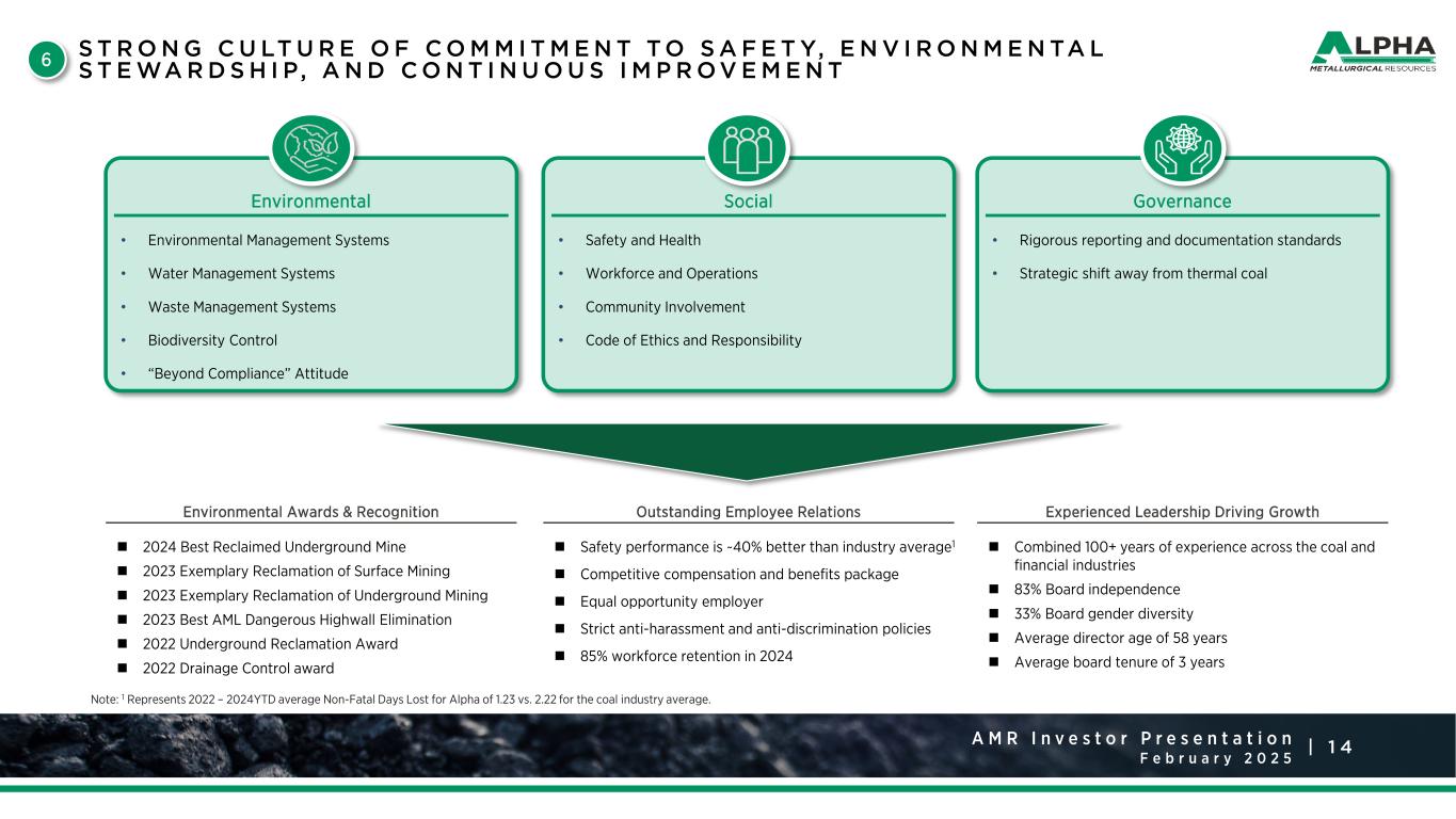 5A M R R a t i n g s A g e n c y P r e s e n t a t i o n J a n u a r y 2 0 2 5 |A M R I n v e s t o r F e b r S A F E T Y, E N V I R O N M E N TA L AWA R E N E S S A N D A C O M M I T M E N T T O C O N T I N U O U S I M P R O V E M E N T – E S S E N T I A L C O M P O N E N T S O F B U S I N E S S E X C E L L E N C E Note: 1 See Appendix for additional detail on Alpha’s key safety statistics vs. the coal industry average. 2 Trees planted since 2016. ~26% Lower Total Reportable Incident Rate vs. Industry Avg.1 ~40% Lower Non-Fatal Days Lost vs. Industry Avg.1 37 2024 Safety & Mine Rescue Awards 5.3 Million Trees Planted2 25+ Environmental Compliance Awards 99.9%+ Water Quality Compliance Rate SAFE PRODUCTION We believe in operating safely and ethically. Every employee is empowered to eliminate at-risk behaviors. ENVIRONMENTAL STEWARDSHIP We conduct our mining business with a focus on environmental stewardship and a commitment to the protection of the environment.