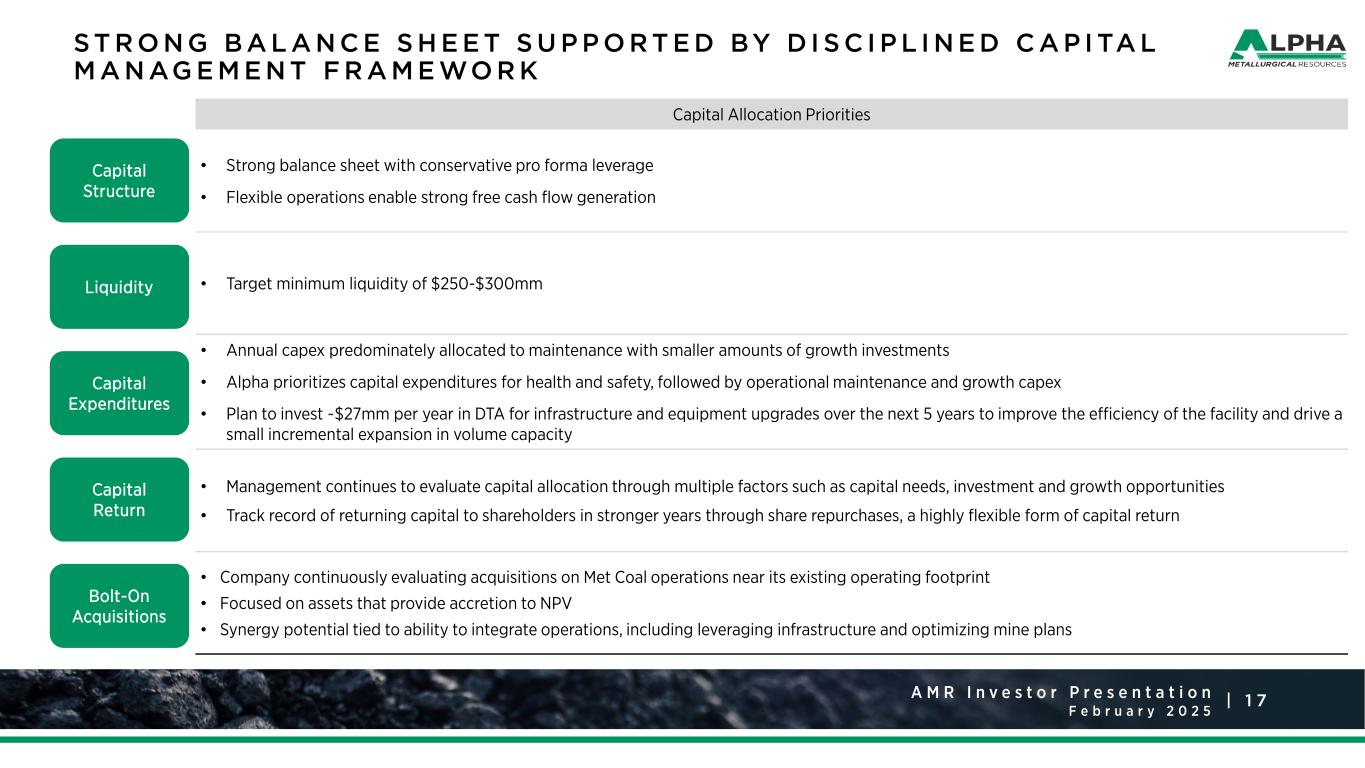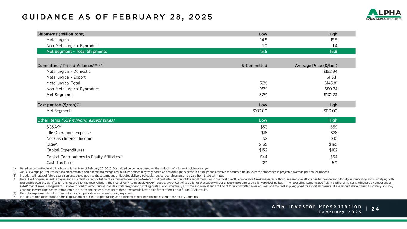 2 4A M R R a t i n g s A g e n c y P r e s e n t a t i o n J a n u a r y 2 0 2 5 |A M R I n v e s t o r F e b r (1) Based on committed and priced coal shipments as of February 20, 2025. Committed percentage based on the midpoint of shipment guidance range. (2) Actual average per-ton realizations on committed and priced tons recognized in future periods may vary based on actual freight expense in future periods relative to assumed freight expense embedded in projected average per-ton realizations. (3) Includes estimates of future coal shipments based upon contract terms and anticipated delivery schedules. Actual coal shipments may vary from these estimates. (4) Note: The Company is unable to present a quantitative reconciliation of its forward-looking non-GAAP cost of coal sales per ton sold financial measures to the most directly comparable GAAP measures without unreasonable efforts due to the inherent difficulty in forecasting and quantifying with reasonable accuracy significant items required for the reconciliation. The most directly comparable GAAP measure, GAAP cost of sales, is not accessible without unreasonable efforts on a forward-looking basis. The reconciling items include freight and handling costs, which are a component of GAAP cost of sales. Management is unable to predict without unreasonable efforts freight and handling costs due to uncertainty as to the end market and FOB point for uncommitted sales volumes and the final shipping point for export shipments. These amounts have varied historically and may continue to vary significantly from quarter to quarter and material changes to these items could have a significant effect on our future GAAP results. (5) Excludes expenses related to non-cash stock compensation and non-recurring expenses. (6) Includes contributions to fund normal operations at our DTA export facility and expected capital investments related to the facility upgrades. G U I DA N C E A S O F F E B R UA RY 2 8 , 2 0 2 5 Shipments (million tons) Low High Metallurgical 14.5 15.5 Non-Metallurgical Byproduct 1.0 1.4 Met Segment - Total Shipments 15.5 16.9 Committed / Priced Volumes(1)(2)(3) % Committed Average Price ($/ton) Metallurgical - Domestic $152.94 Metallurgical - Export $113.11 Metallurgical Total 32% $143.81 Non-Metallurgical Byproduct 95% $80.74 Met Segment 37% $131.73 Cost per ton ($/ton)(4) Low High Met Segment $103.00 $110.00 Other Items (US$ millions, except taxes) Low High SG&A(5) $53 $59 Idle Operations Expense $18 $28 Net Cash Interest Income $2 $10 DD&A $165 $185 Capital Expenditures $152 $182 Capital Contributions to Equity Affiliates(6) $44 $54 Cash Tax Rate 0% 5%