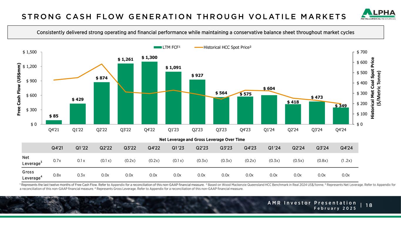 1 8A M R R a t i n g s A g e n c y P r e s e n t a t i o n J a n u a r y 2 0 2 5 |A M R I n v e s t o r F e b r S T R O N G C AS H F LOW G E N E R AT I O N T H R O U G H VO L AT I L E M A R K E T S Net Leverage and Gross Leverage Over Time 1 Represents the last twelve months of Free Cash Flow. Refer to Appendix for a reconciliation of this non-GAAP financial measure. 2 Based on Wood Mackenzie Queensland HCC Benchmark in Real 2024 US$/tonne. 3 Represents Net Leverage. Refer to Appendix for a reconciliation of this non-GAAP financial measure. 4 Represents Gross Leverage. Refer to Appendix for a reconciliation of this non-GAAP financial measure. Consistently delivered strong operating and financial performance while maintaining a conservative balance sheet throughout market cycles $ 85 $ 429 $ 874 $ 1,261 $ 1,300 $ 1,091 $ 927 $ 564 $ 575 $ 604 $ 418 $ 473 $ 349 $ 0 $ 100 $ 200 $ 300 $ 400 $ 500 $ 600 $ 700 $ 0 $ 300 $ 600 $ 900 $ 1,200 $ 1,500 Q4'21 Q1'22 Q2'22 Q3'22 Q4'22 Q1'23 Q2'23 Q3'23 Q4'23 Q1'24 Q2'24 Q3'24 Q4'24 H is to ri ca l M et C oa l S po t P ri ce Fr ee C as h Fl ow ( U S$ m m ) LTM FCF¹ Historical HCC Spot Price² Q4'21 Q1 '22 Q2'22 Q3'22 Q4'22 Q1 '23 Q2'23 Q3'23 Q4'23 Q1 '24 Q2'24 Q3'24 Q4'24 Net Leverage3 0.7x 0.1 x (0.1 x) (0.2x) (0.2x) (0.1 x) (0.3x) (0.3x) (0.2x) (0.3x) (0.5x) (0.8x) (1 .2x) Gros s Leverage4 0.8x 0.3x 0.0x 0.0x 0.0x 0.0x 0.0x 0.0x 0.0x 0.0x 0.0x 0.0x 0.0x ($ /M et ric To nn e)