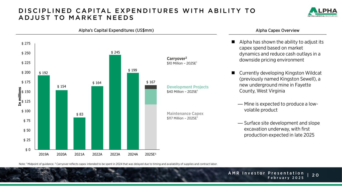 2 0A M R R a t i n g s A g e n c y P r e s e n t a t i o n J a n u a r y 2 0 2 5 |A M R I n v e s t o r F e b r D I S C I P L I N E D C A P I TA L E X P E N D I T U R E S W I T H A B I L I T Y TO A DJ U S T TO M A R K E T N E E D S Alpha’s Capital Expenditures (US$mm) Alpha Capex Overview  Alpha has shown the ability to adjust its capex spend based on market dynamics and reduce cash outlays in a downside pricing environment  Currently developing Kingston Wildcat (previously named Kingston Sewell), a new underground mine in Fayette County, West Virginia — Mine is expected to produce a low- volatile product — Surface site development and slope excavation underway, with first production expected in late 2025 Note: 1 Midpoint of guidance. 2 Carryover reflects capex intended to be spent in 2024 that was delayed due to timing and availability of supplies and contract labor. Carryover2 $10 Million – 2025E¹ Maintenance Capex $117 Million – 2025E¹ Development Projects $40 Million – 2025E¹ $ 192 $ 154 $ 83 $ 164 $ 245 $ 199 $ 167 $ 0 $ 25 $ 50 $ 75 $ 100 $ 125 $ 150 $ 175 $ 200 $ 225 $ 250 $ 275 2019A 2020A 2021A 2022A 2023A 2024A 2025E¹ In m ill io ns