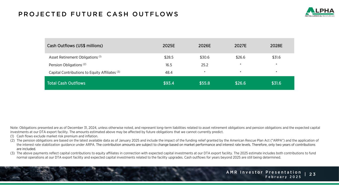2 3A M R R a t i n g s A g e n c y P r e s e n t a t i o n J a n u a r y 2 0 2 5 |A M R I n v e s t o r F e b r P R OJ E C T E D F U T U R E C AS H O U T F LOWS Note: Obligations presented are as of December 31, 2024, unless otherwise noted, and represent long-term liabilities related to asset retirement obligations and pension obligations and the expected capital investments at our DTA export facility. The amounts estimated above may be affected by future obligations that we cannot currently predict. (1) Cash flows exclude market risk premium and inflation. (2) The pension obligations are based on the latest available data as of January 2025 and include the impact of the funding relief granted by the American Rescue Plan Act ("ARPA") and the application of the interest rate stabilization guidance under ARPA. The contribution amounts are subject to change based on market performance and interest rate levels. Therefore, only two years of contributions are included. (3) The above payments reflect capital contributions to equity affiliates in connection with expected capital investments at our DTA export facility. The 2025 estimate includes both contributions to fund normal operations at our DTA export facility and expected capital investments related to the facility upgrades. Cash outflows for years beyond 2025 are still being determined. Cash Outflows (US$ millions) 2025E 2026E 2027E 2028E Asset Retirement Obligations (1) $28.5 $30.6 $26.6 $31.6 Pension Obligations (2) 16.5 25.2 * * Capital Contributions to Equity Affiliates (3) 48.4 * * * Total Cash Outflows $93.4 $55.8 $26.6 $31.6