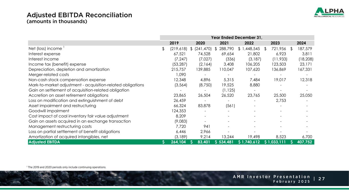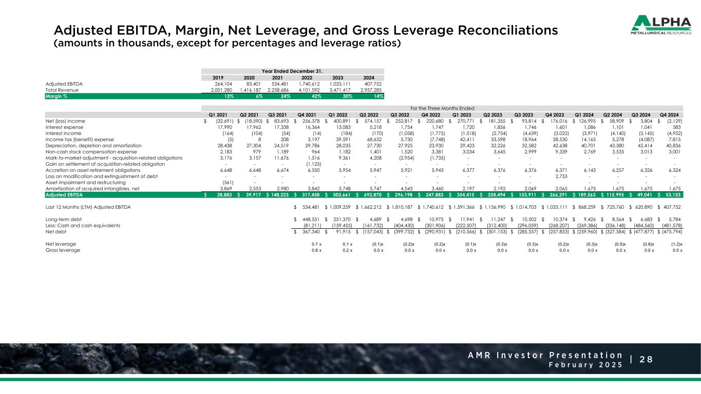 2 7A M R R a t i n g s A g e n c y P r e s e n t a t i o n J a n u a r y 2 0 2 5 |A M R I n v e s t o r F e b r Adjusted EBITDA Reconciliation (amounts in thousands) 1 The 2019 and 2020 periods only include continuing operations. 2019 2020 2021 2022 2023 2024 Net (loss) income 1 (219,618)$ (241,470)$ 288,790$ 1,448,545$ 721,956$ 187,579$ Interest expense 67,521 74,528 69,654 21,802 6,923 3,811 Interest income (7,247) (7,027) (336) (3,187) (11,933) (18,208) Income tax (benefit) expense (53,287) (2,164) 3,408 106,205 123,503 23,171 Depreciation, depletion and amortization 215,757 139,885 110,047 107,620 136,869 167,331 Merger-related costs 1,090 - - - - - Non-cash stock compensation expense 12,348 4,896 5,315 7,484 19,017 12,318 Mark-to-market adjustment - acquisition-related obligations (3,564) (8,750) 19,525 8,880 - - Gain on settlement of acquisition-related obligation - - (1,125) - - - Accretion on asset retirement obligations 23,865 26,504 26,520 23,765 25,500 25,050 Loss on modification and extinguishment of debt 26,459 - - - 2,753 - Asset impairment and restructuring 66,324 83,878 (561) - - - Goodwill impairment 124,353 - - - - - Cost impact of coal inventory fair value adjustment 8,209 - - - - - Gain on assets acquired in an exchange transaction (9,083) - - - - - Management restructuring costs 7,720 941 - - - - Loss on partial settlement of benefit obligations 6,446 2,966 - - - - Amortization of acquired intangibles, net (3,189) 9,214 13,244 19,498 8,523 6,700 Adjusted EBITDA 264,104$ 83,401$ 534,481$ 1,740,612$ 1,033,111$ 407,752$ Year Ended December 31,