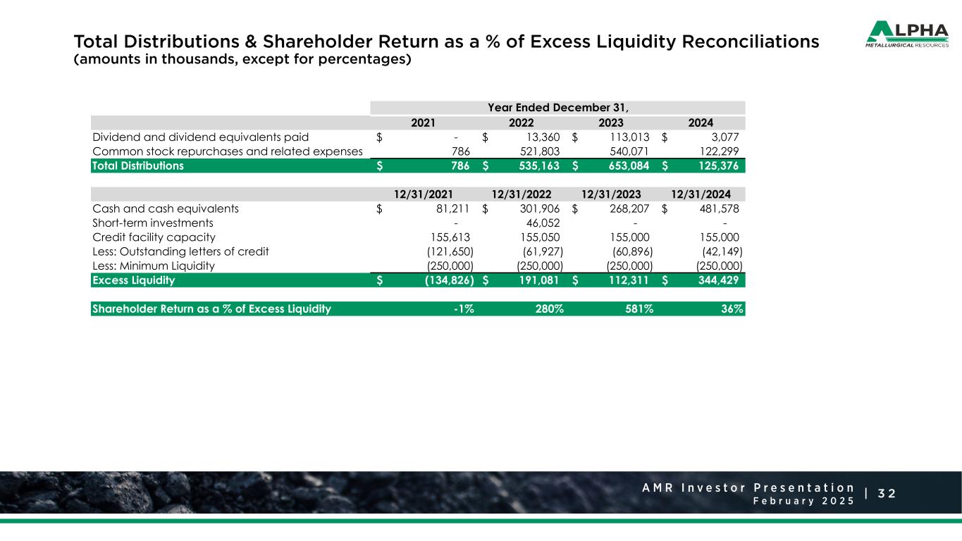 3 2A M R R a t i n g s A g e n c y P r e s e n t a t i o n J a n u a r y 2 0 2 5 |A M R I n v e s t o r F e b r Total Distributions & Shareholder Return as a % of Excess Liquidity Reconciliations (amounts in thousands, except for percentages) 2021 2022 2023 2024 Dividend and dividend equivalents paid -$ 13,360$ 113,013$ 3,077$ Common stock repurchases and related expenses 786 521,803 540,071 122,299 Total Distributions 786$ 535,163$ 653,084$ 125,376$ 12/31/2021 12/31/2022 12/31/2023 12/31/2024 Cash and cash equivalents 81,211$ 301,906$ 268,207$ 481,578$ Short-term investments - 46,052 - - Credit facility capacity 155,613 155,050 155,000 155,000 Less: Outstanding letters of credit (121,650) (61,927) (60,896) (42,149) Less: Minimum Liquidity (250,000) (250,000) (250,000) (250,000) Excess Liquidity (134,826)$ 191,081$ 112,311$ 344,429$ Shareholder Return as a % of Excess Liquidity -1% 280% 581% 36% Year Ended December 31,